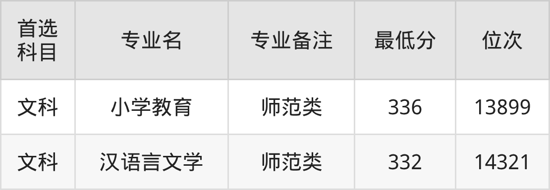 1、小学教育(师范类):336分(文科)、位次13899名;