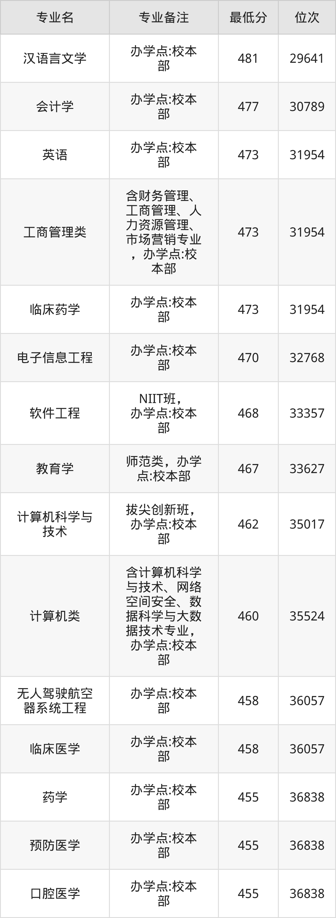 1、汉语言文学(办学点:校本部):481分、位次29641名;