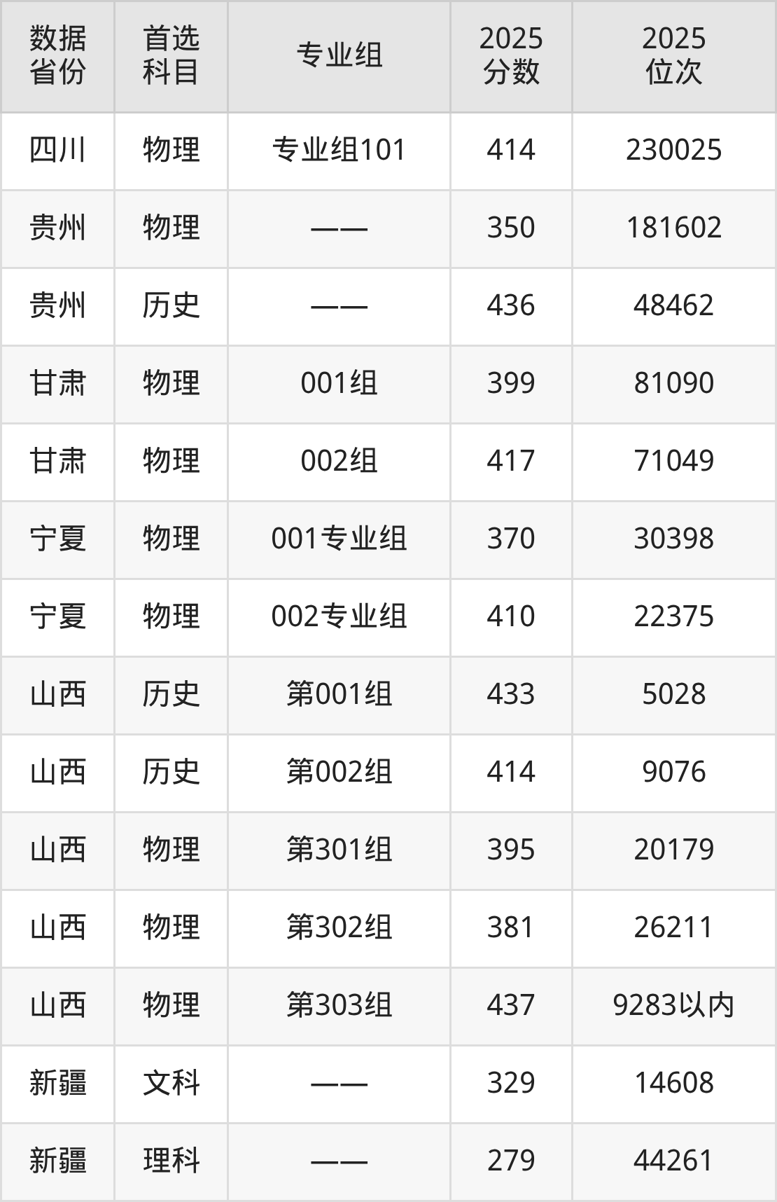 2025年湖北中医药高等专科学校全国录取分数线最低是279分,最高是490分,平均分在420分左右。在多数地区录取最低分均超过330分。低于330分能上的地区只有新疆和吉林,高于平均值较多的是江西、浙江、四川和广东等地,均有专业组最低分在462分及以上。
