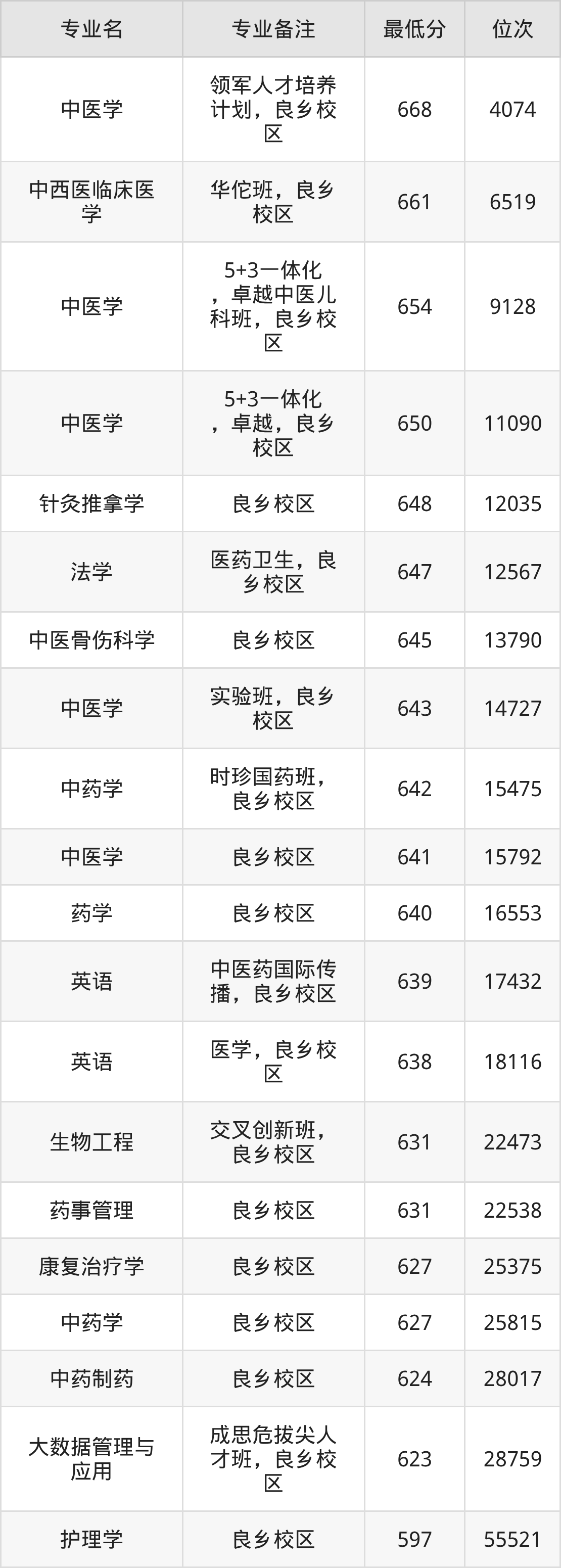 二、北京中医药大学各专业最低分