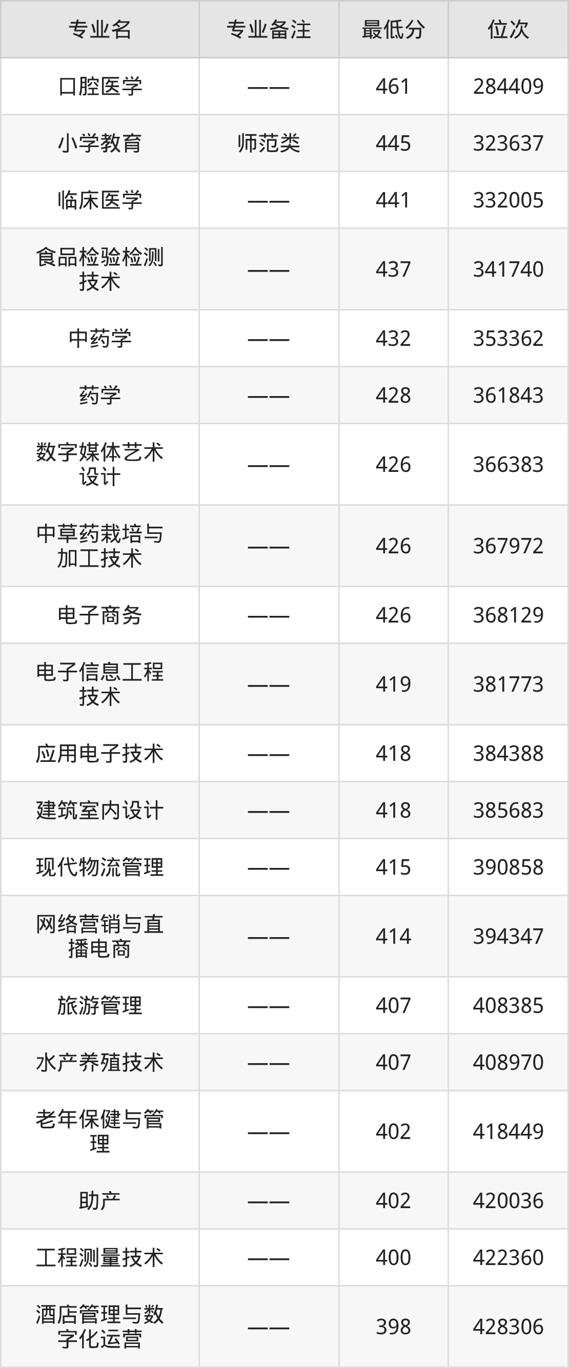 2025年汉中职业技术学院全国录取分数线是150分到421分之间,其中在河北省录取最低分:物理组294分、历史组366分。参考山东招录数据,各专业分数线是:口腔医学461分、小学教育(师范类)445分、临床医学441分等。