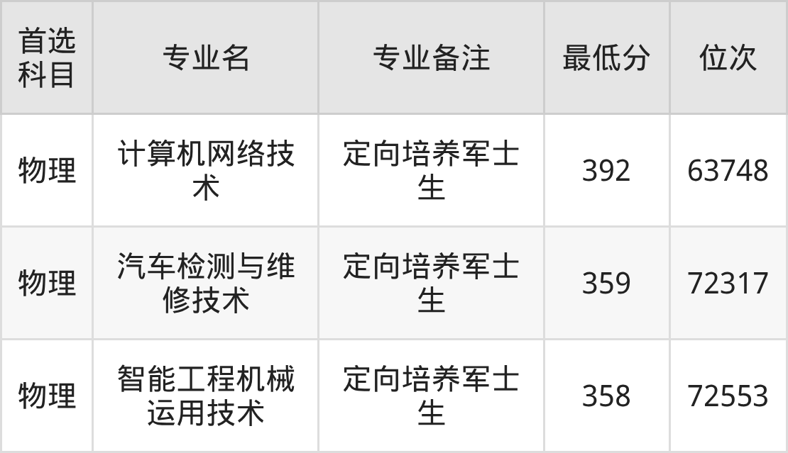 2、汽车检测与维修技术(定向培养军士生):359分(物理类)、位次72317名;