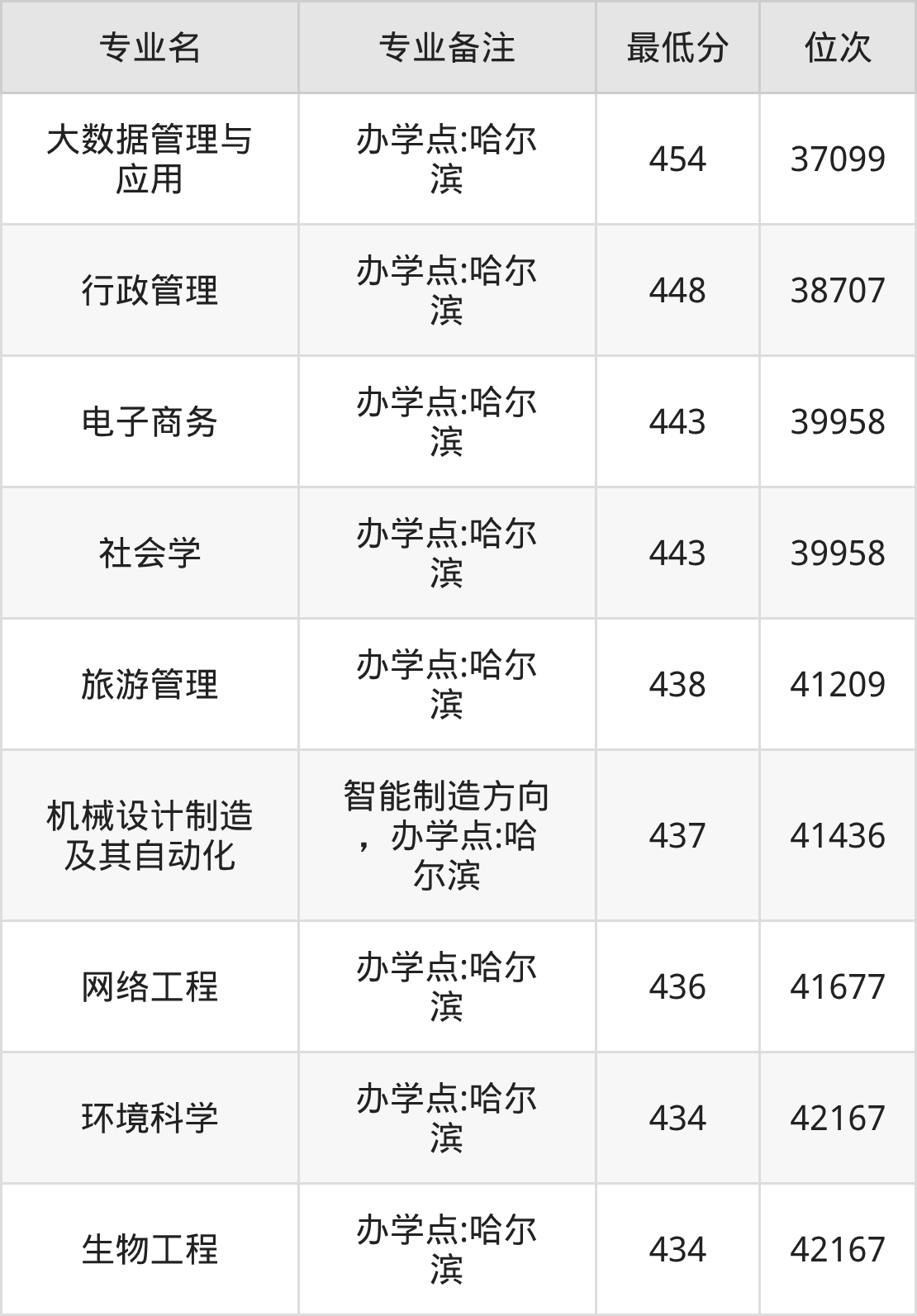 1、大数据管理与应用(办学点:哈尔滨):454分、位次37099名;