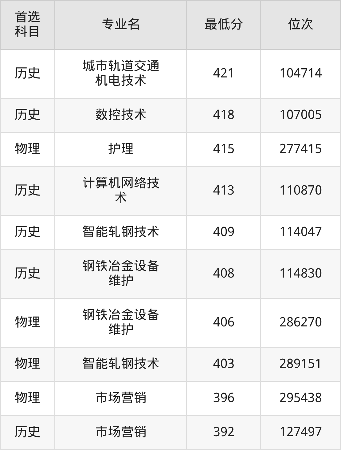 下面是安徽冶金科技职业学院各省最低分汇总,各专业组录取分数线可参考下方图片: