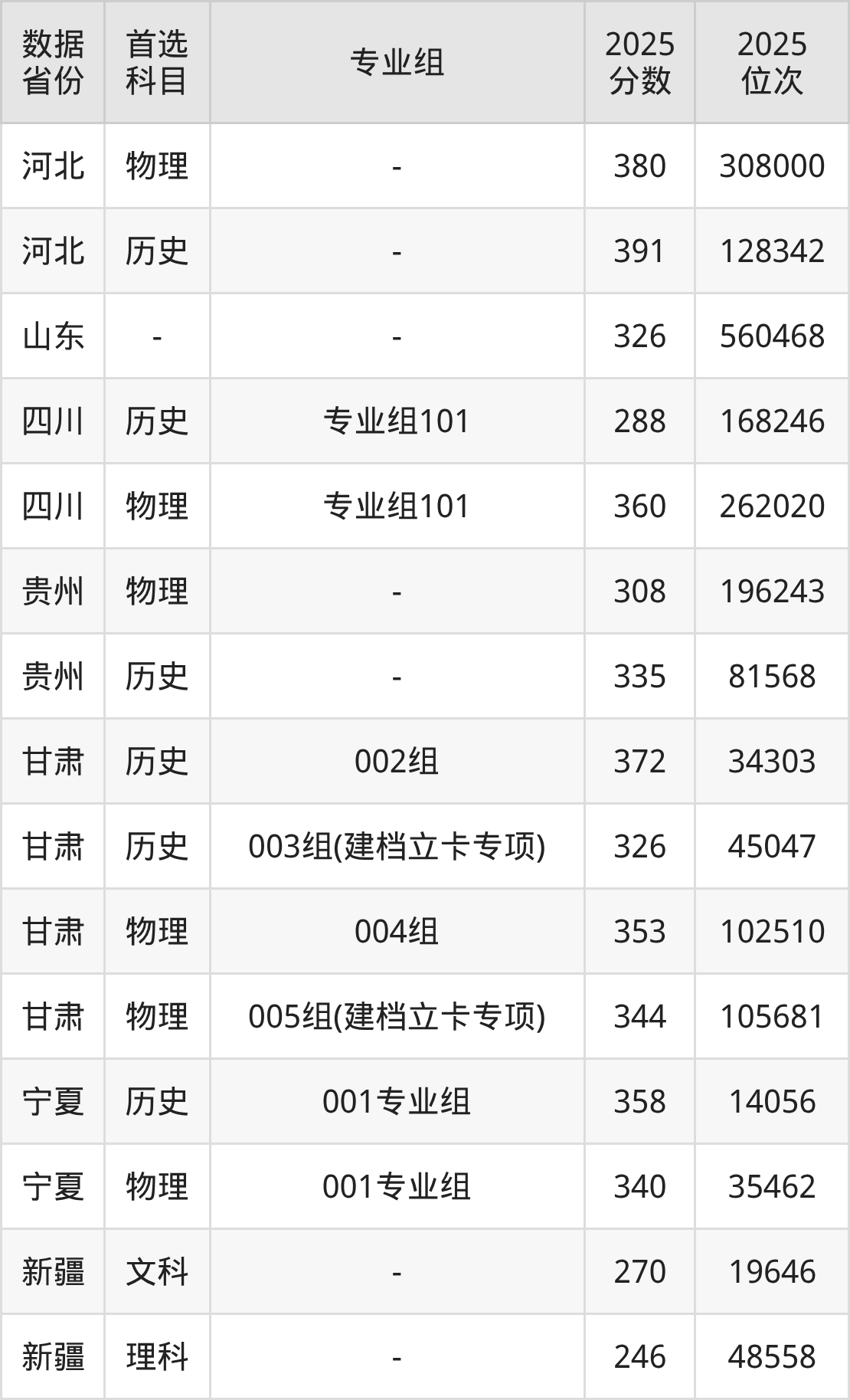 2025年兰州职业技术学院全国录取分数线最低是246分,最高是391分,平均分在333分左右。在多数地区录取最低分均超过290分。低于290分能上的地区只有四川和新疆,高于平均值较多的是河北、四川、宁夏和甘肃等地,均有专业组最低分在344分及以上。