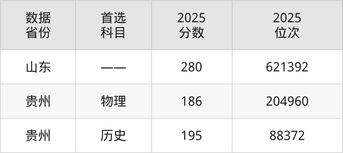 2025年贵州水利水电职业技术学院全国录取分数线是186分到280分之间,其中在贵州省录取最低分:物理组186分、历史组195分。参考山东招录数据,各专业分数线是:大数据技术(中外合作)280分等。
