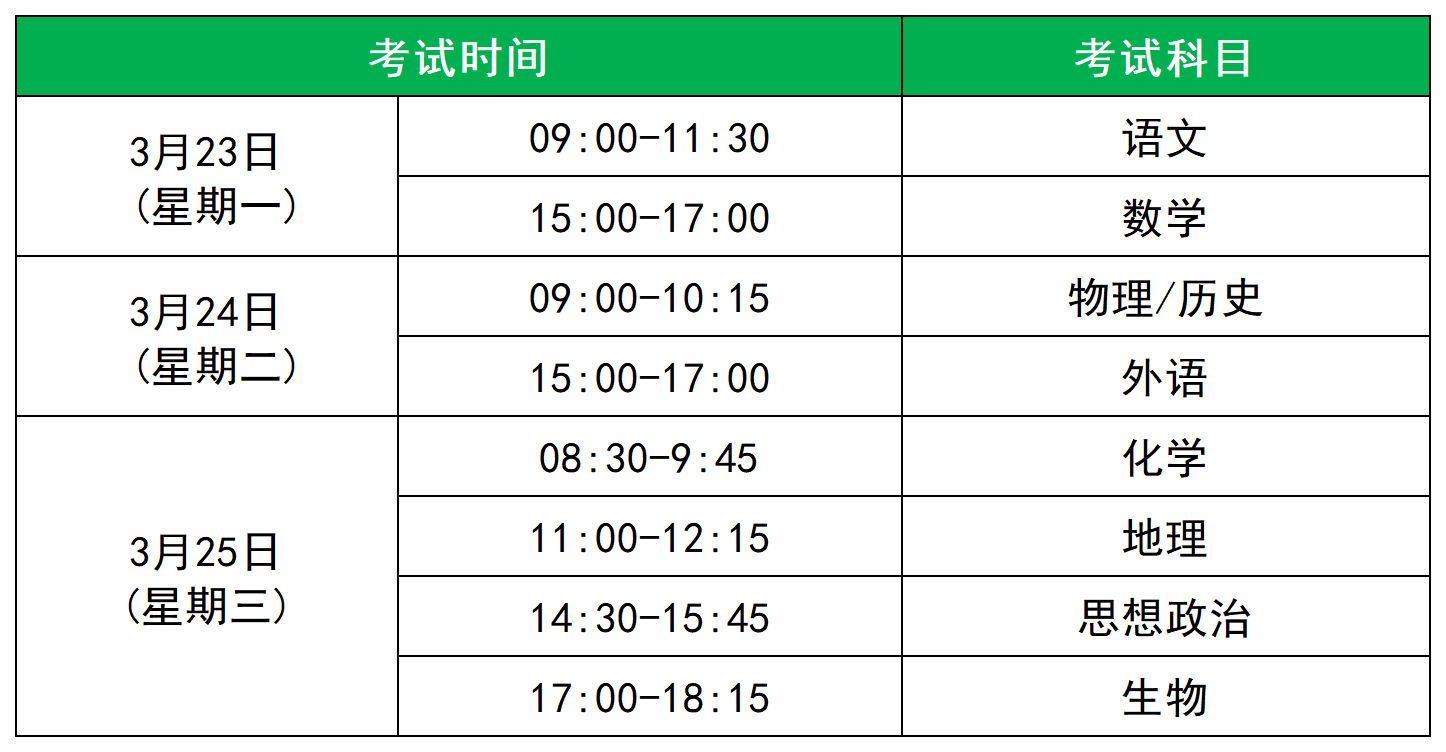 3月24日(星期二):上午9:00-10:15考物理/历史,下午15:00-17:00考外语。