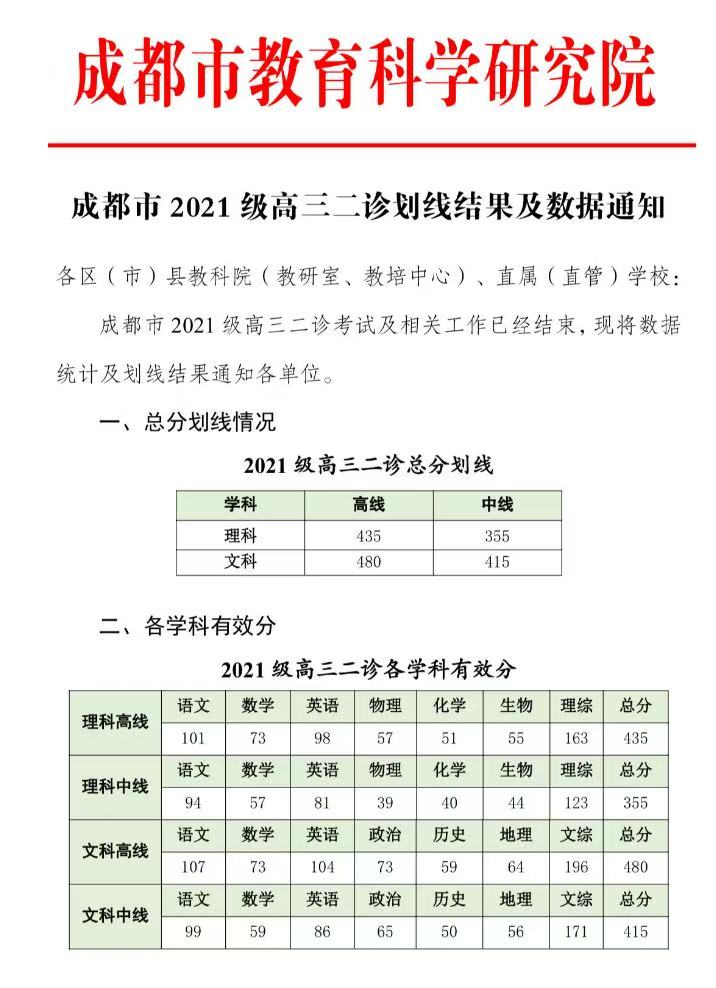 成都高三二诊分数线由成都市教育科学研究院统一划定,通常设置两条参考线:高线(对应原一本线/特控线)和中线(对应本科线)。历年分数线及部分科目有效分如下: