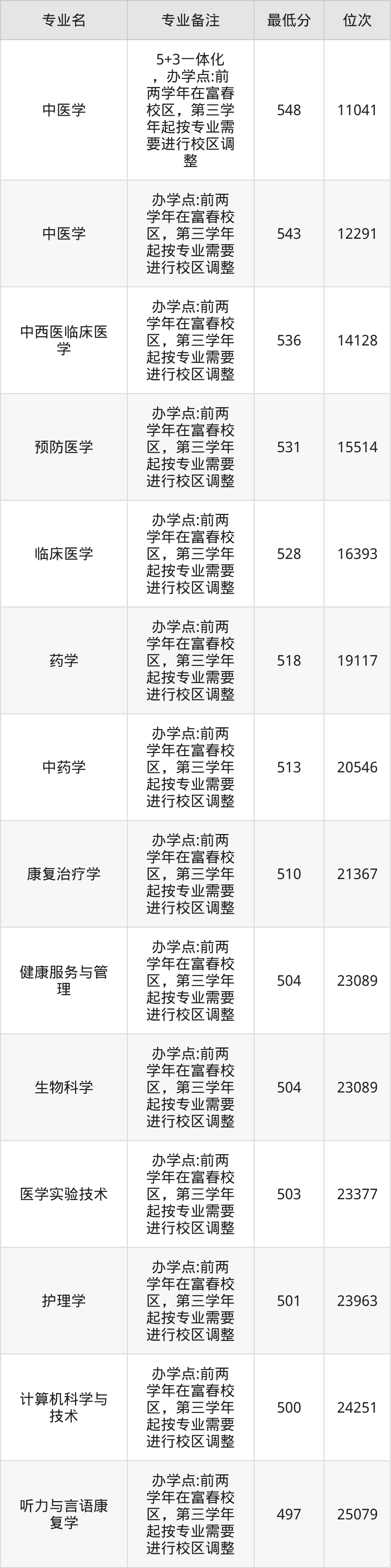 1、中医学(5+3一体化,办学点:前两学年在富春校区,第三学年起按专业需要进行校区调整):548分、位次11041名;