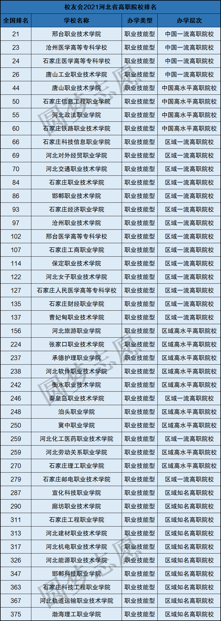 从排名上来看并没有实力非常突出的高职院校。排名最高的邢台职业技术学院位于全国第21名,算不上国内顶尖高职院校。