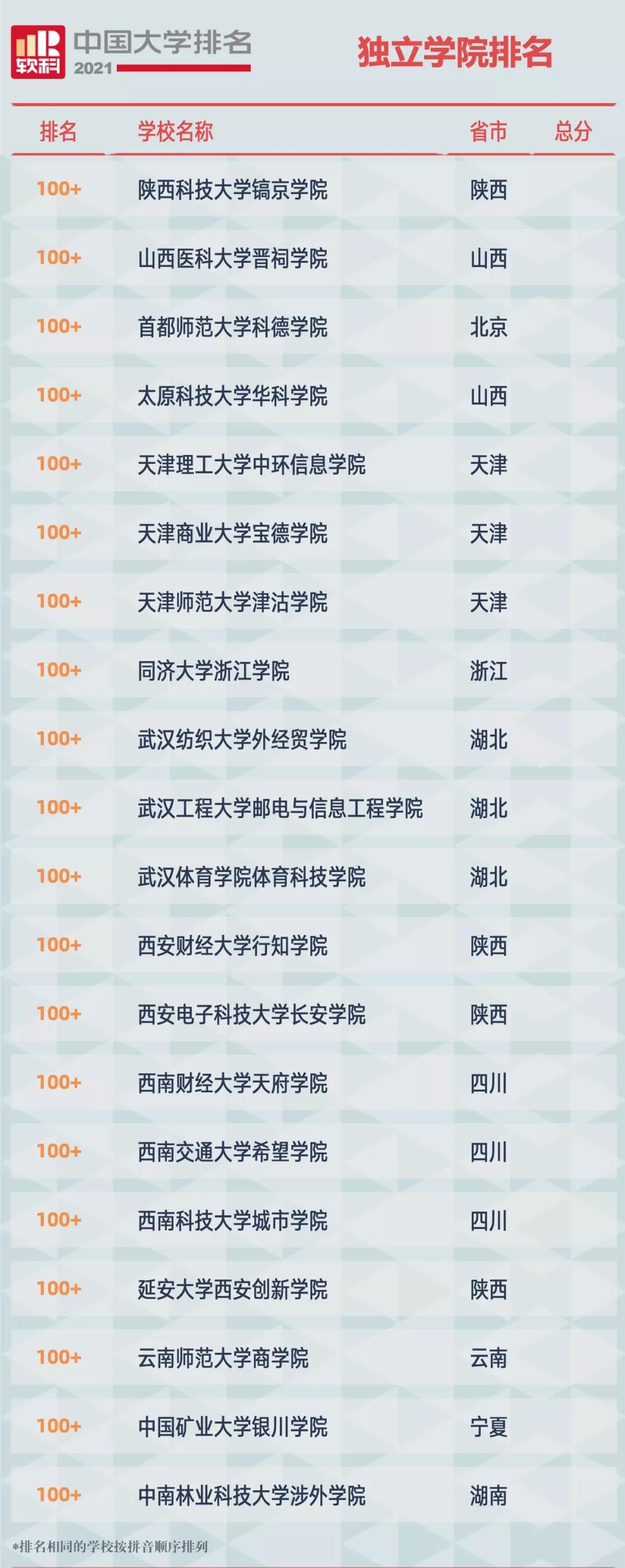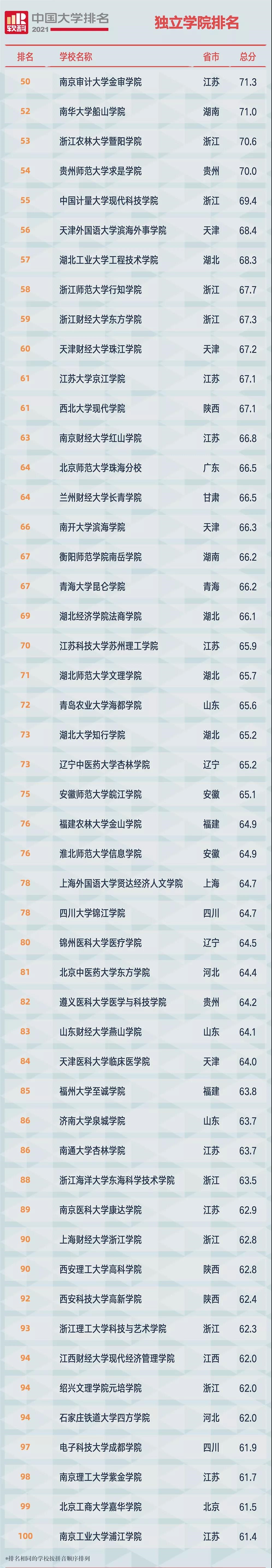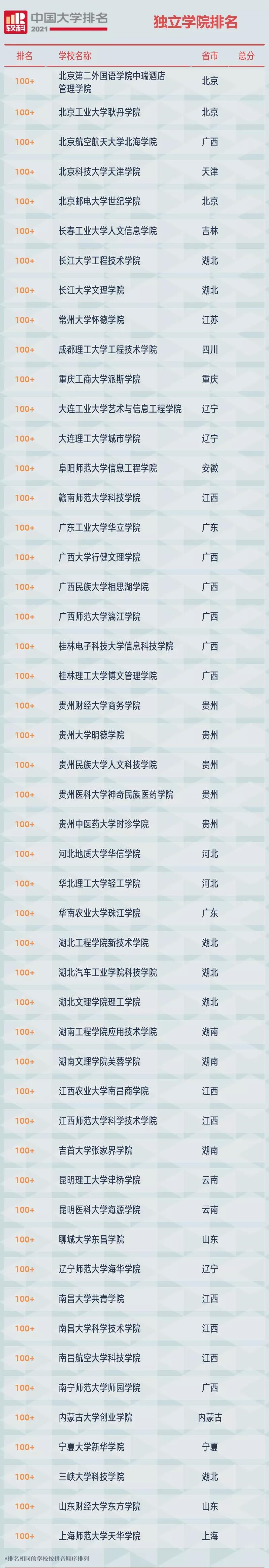 近日,软科发布“2021软科中国大学排名”。其中,社会组织独立举办或参与举办的高校是中国高等教育体系的重要组成部分,2021软科中国大学排名采用人才培养相关指标,对独立学院进行了排名,具体如下。