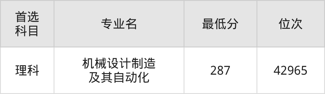 1、机械设计制造及其自动化:287分(理科)、位次42965名。