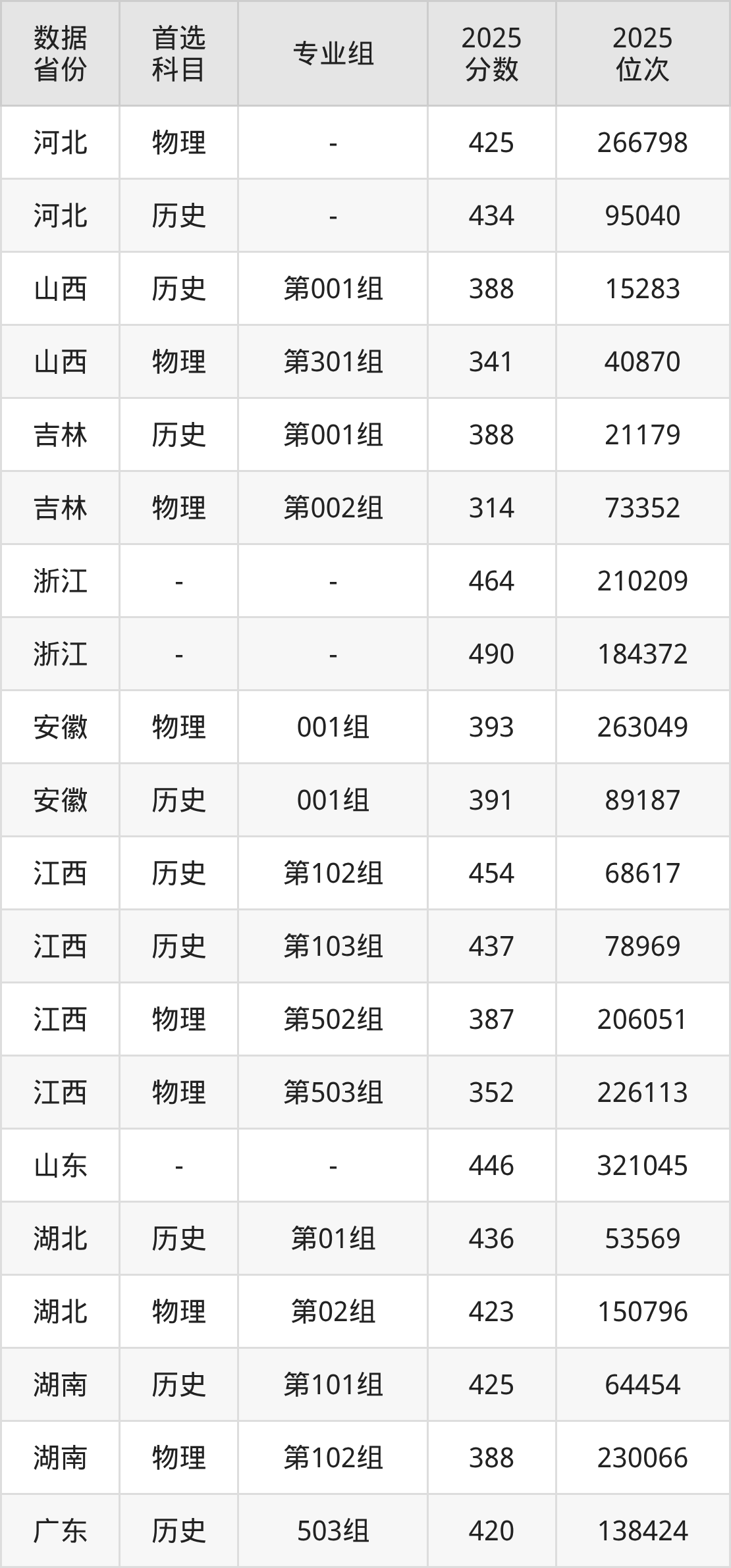 2025年江西司法警官职业学院全国录取分数线最低是314分,最高是490分,平均分在400分左右。在多数地区录取最低分均超过340分。低于340分能上的地区只有吉林,高于平均值较多的是浙江、山东、贵州和江西等地,均有专业组最低分在437分及以上。