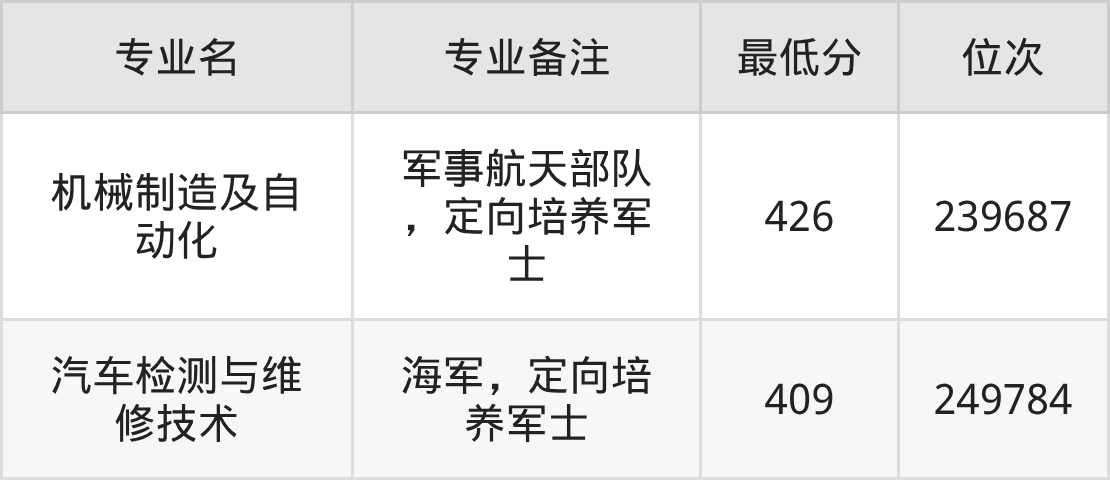 1、机械制造及自动化(军事航天部队,定向培养军士):426分、位次239687名;