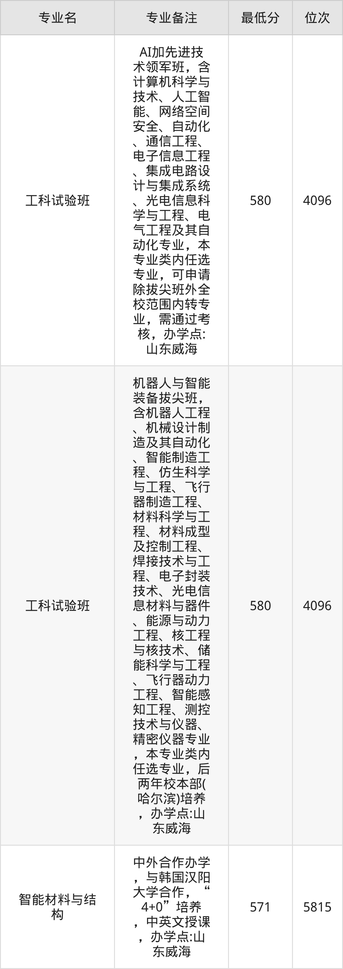 2、工科试验班(机器人与智能装备拔尖班,含机器人工程、机械设计制造及其自动化、智能制造工程、仿生科学与工程、飞行器制造工程、材料科学与工程、材料成型及控制工程、焊接技术与工程、电子封装技术、光电信息材料与器件、能源与动力工程、核工程与核技术、储能科学与工程、飞行器动力工程、智能感知工程、测控技术与仪器、精密仪器专业,本专业类内任选专业,后两年校本部(哈尔滨)培养,办学点:山东威海):580分、位次4096名;