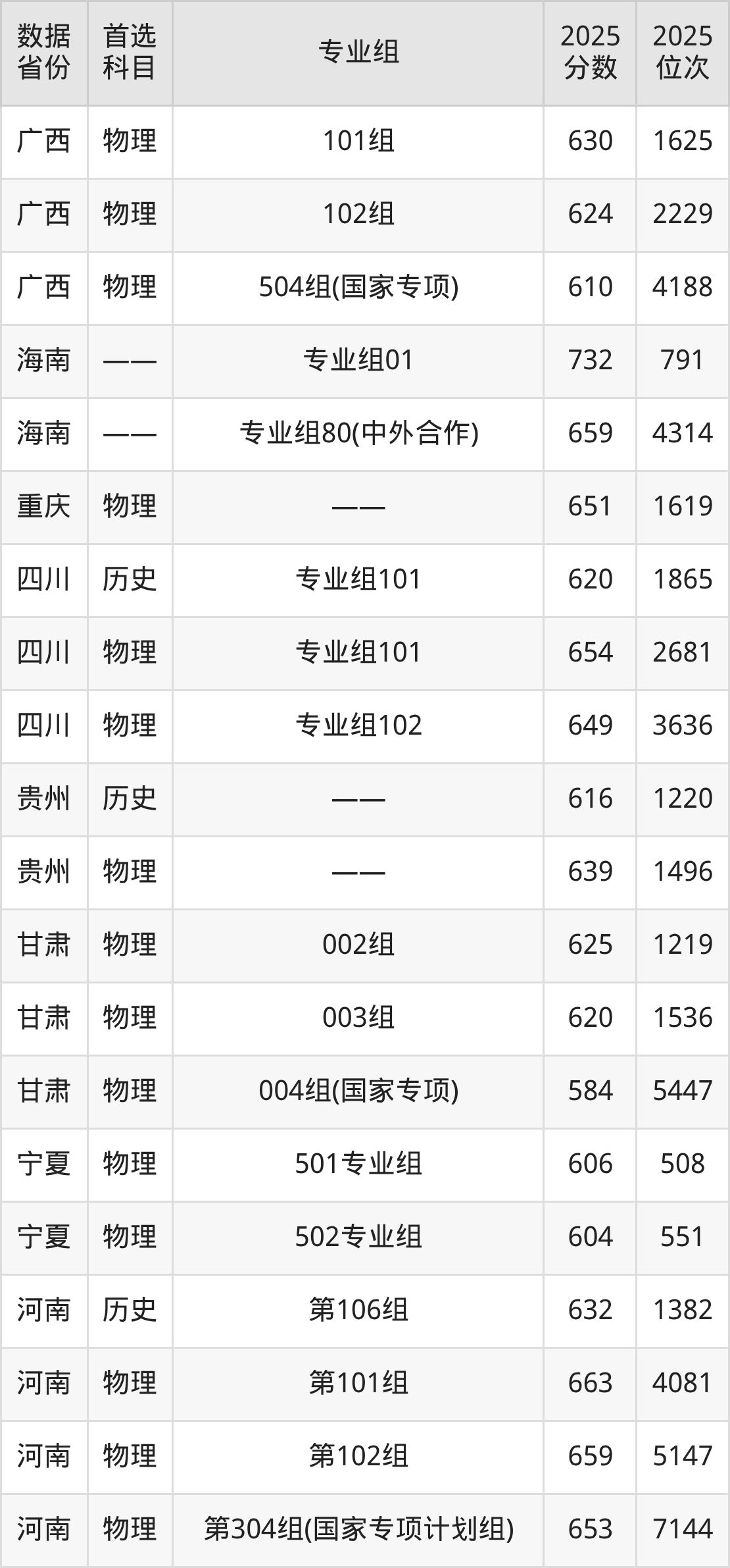 1、工科试验班(AI加先进技术领军班,含计算机科学与技术、人工智能、网络空间安全、自动化、通信工程、电子信息工程、集成电路设计与集成系统、光电信息科学与工程、电气工程及其自动化专业,本专业类内任选专业,可申请除拔尖班外全校范围内转专业,需通过考核,办学点:山东威海):580分、位次4096名;
