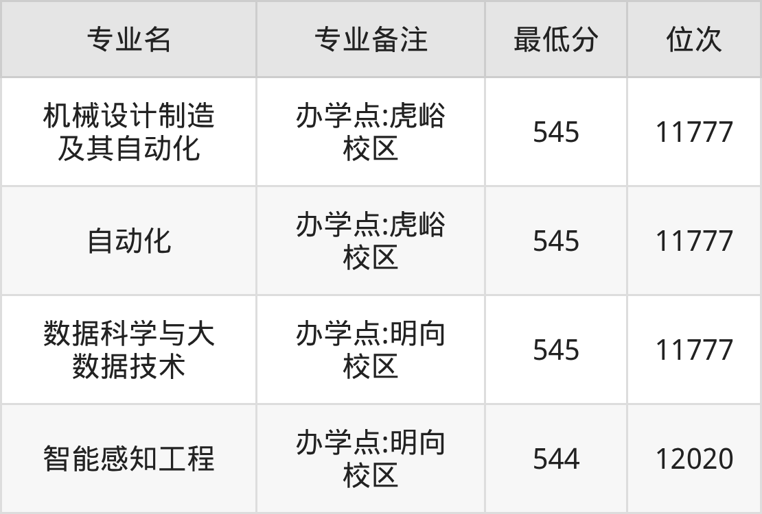 1、机械设计制造及其自动化(办学点:虎峪校区):545分、位次11777名;