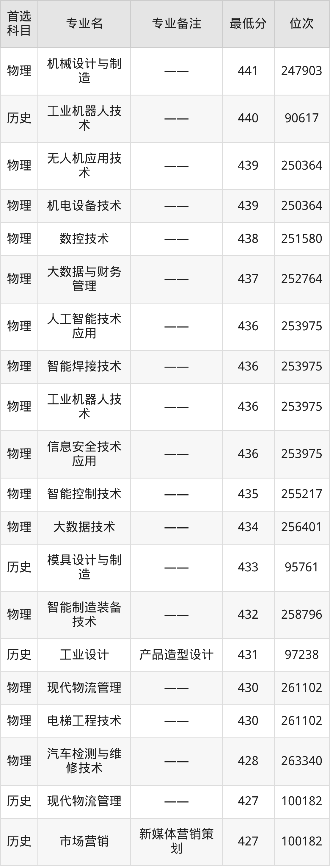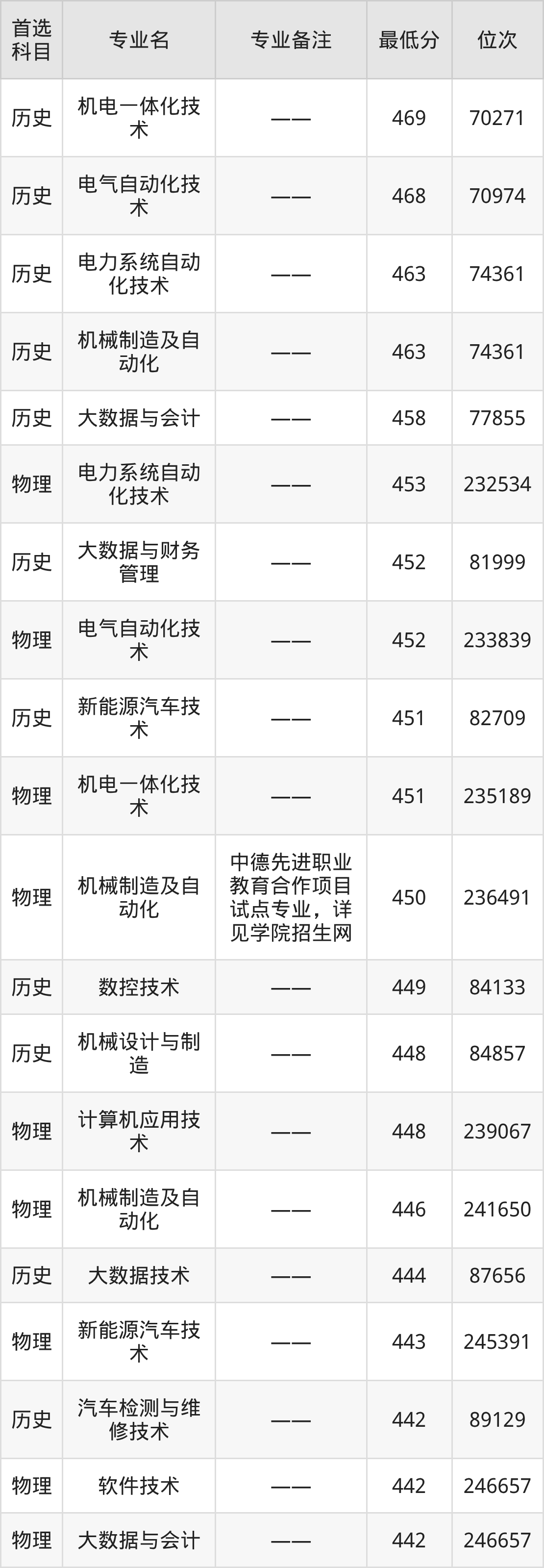 1、机电一体化技术:469分(历史类)、位次70271名;