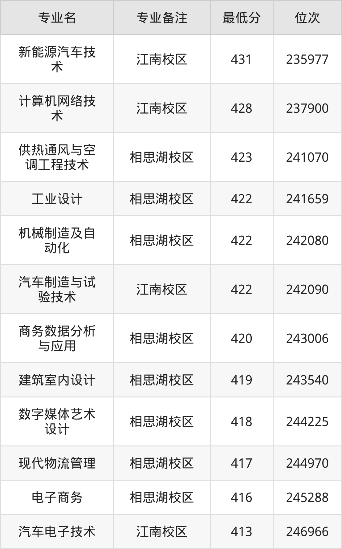 1、新能源汽车技术(江南校区):431分、位次235977名;