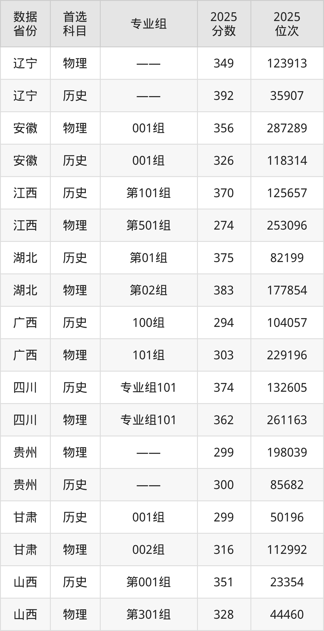 2025年江西传媒职业学院全国录取分数线最低是274分,最高是392分,平均分在336分左右。在多数地区录取最低分均超过300分。低于300分能上的地区只有贵州、甘肃和广西和江西,高于平均值较多的是辽宁、湖北、四川和江西等地,均有专业组最低分在370分及以上。