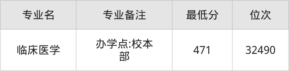 1、临床医学(办学点:校本部):471分、位次32490名。