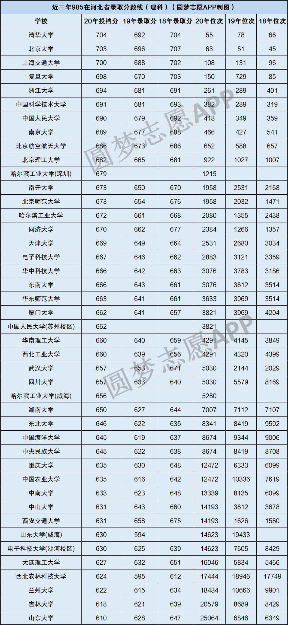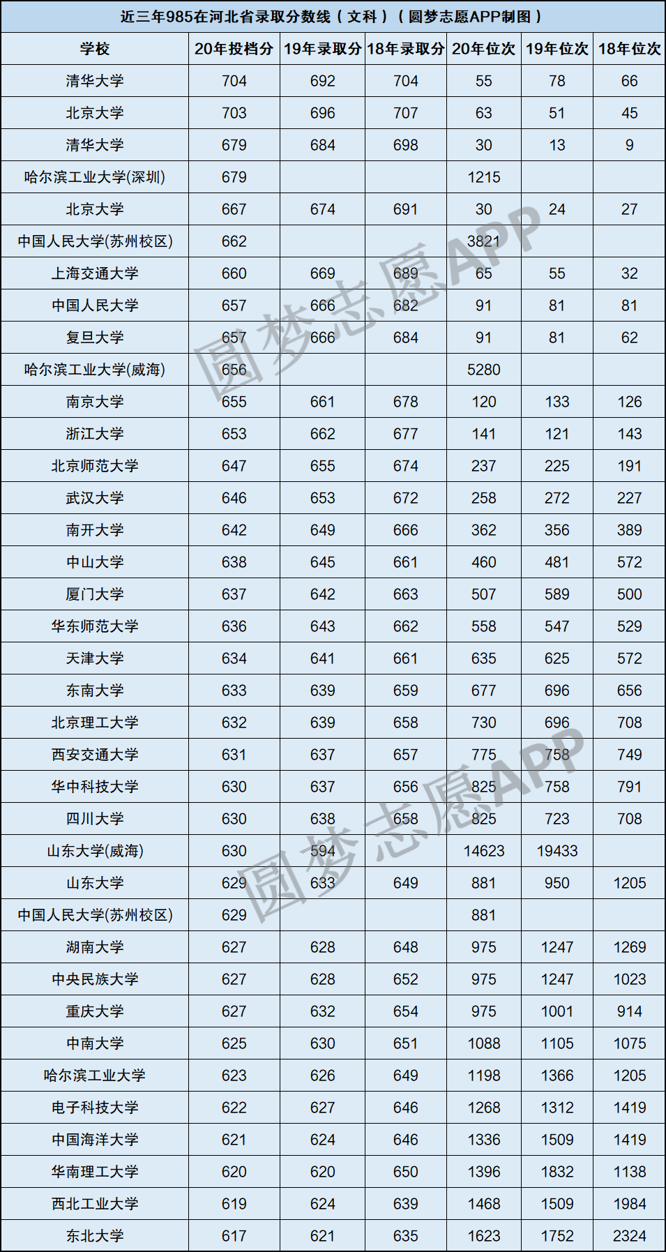 根据近三年河北省教育考试院公布的招录数据,我们为大家整理了全国985大学在河北省2018年-2020年的文理科录取分数和位次,供考生和家长们参考,具体如下: