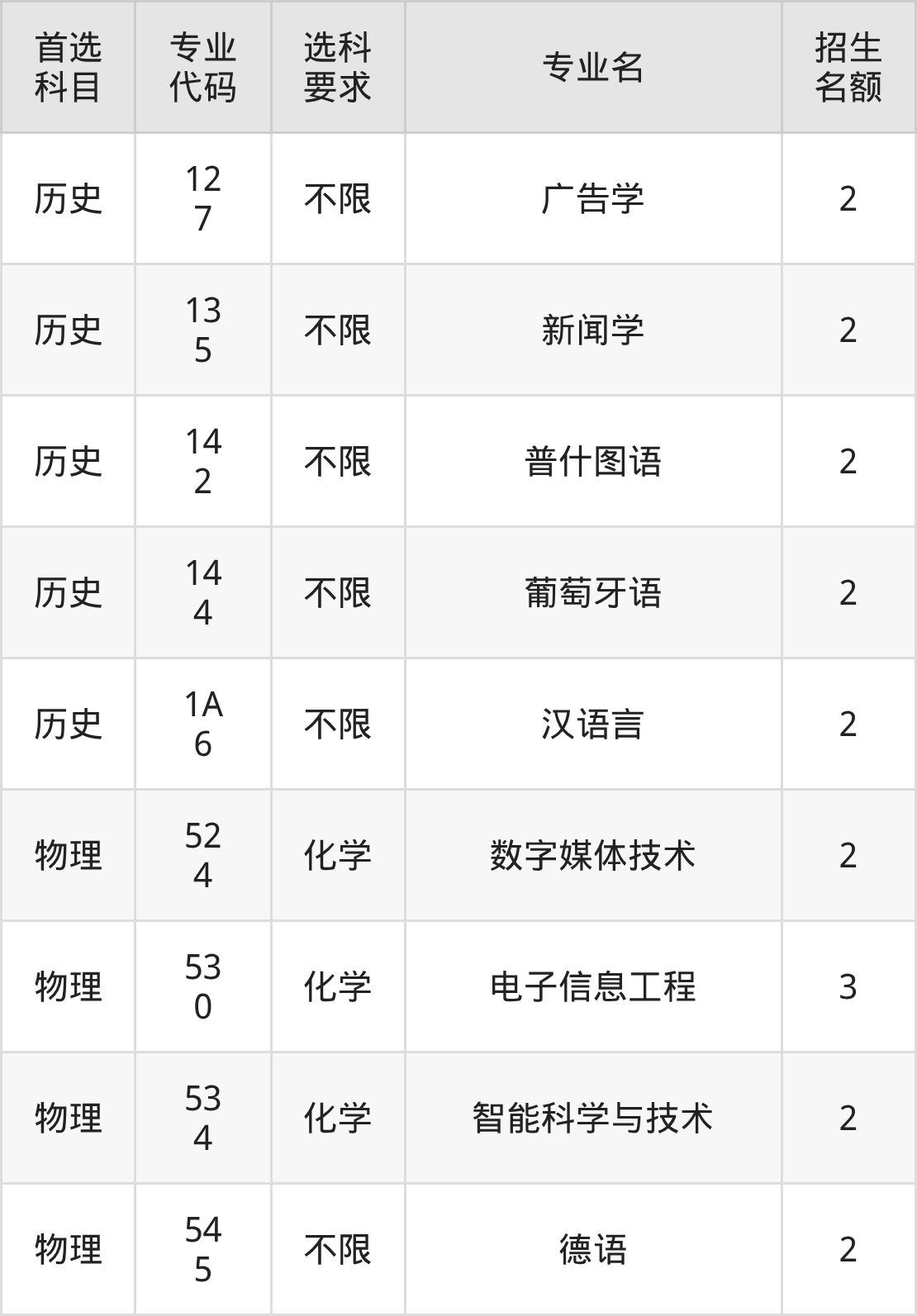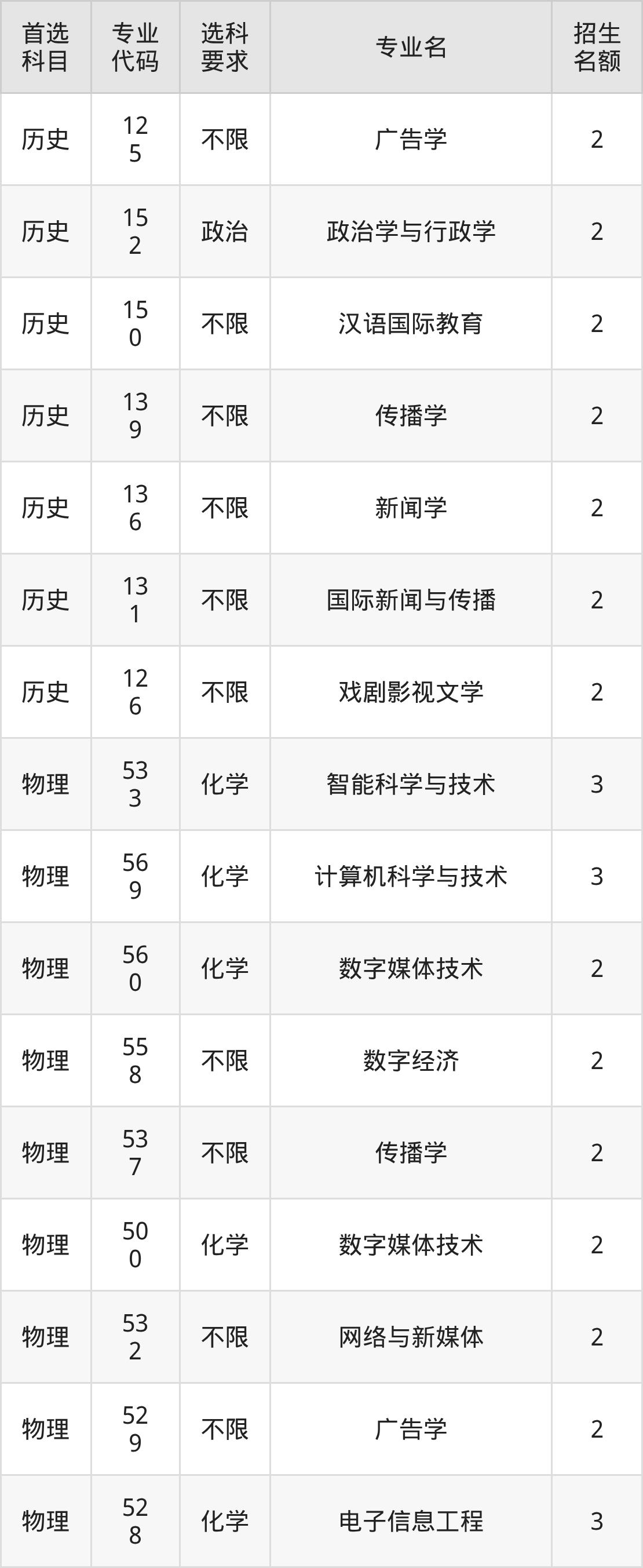 2025年中国传媒大学在重庆市本科批招生中,总计划人数为35人,招生专业有13个,包括广告学(4人)、政治学与行政学(2人)、汉语国际教育(2人)、传播学(4人)等。