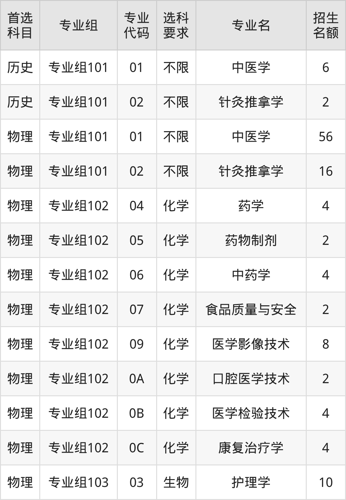 各专业选科要求、招生名额汇总如下: