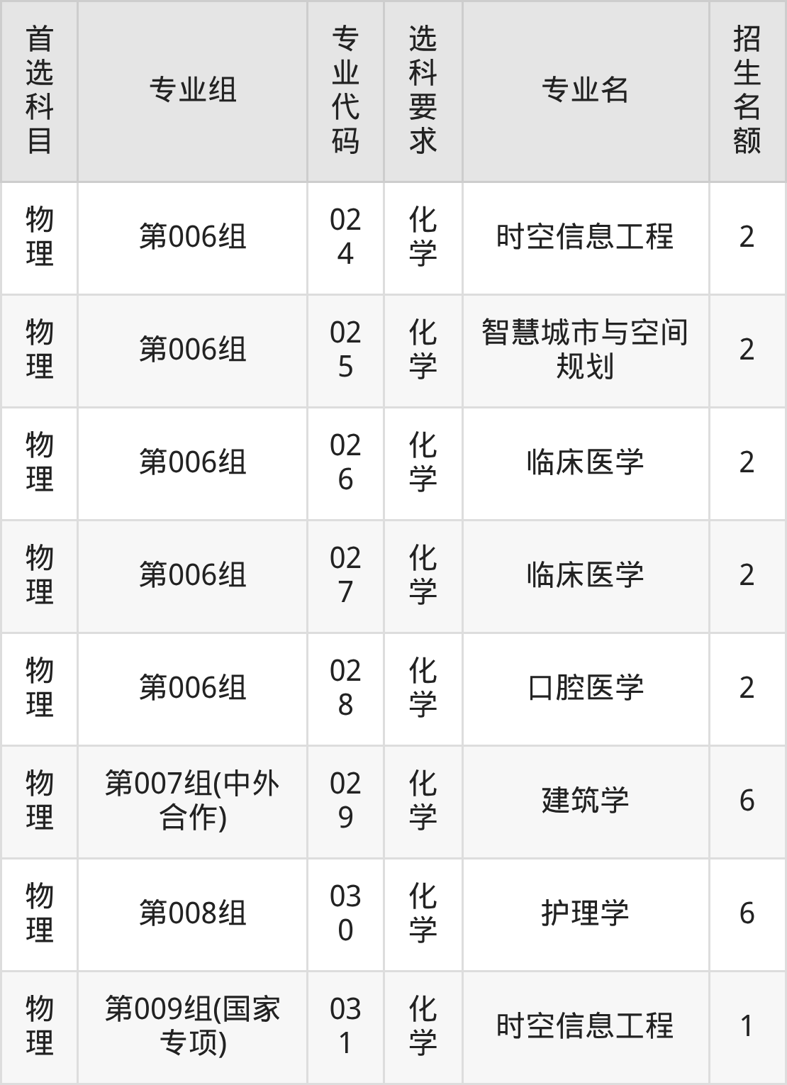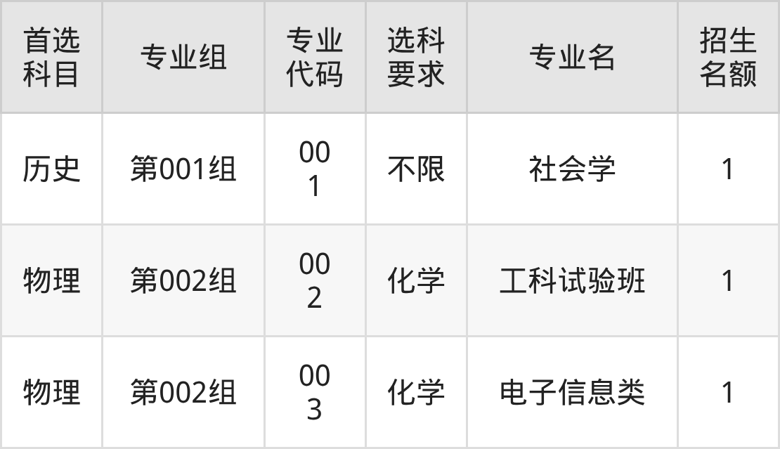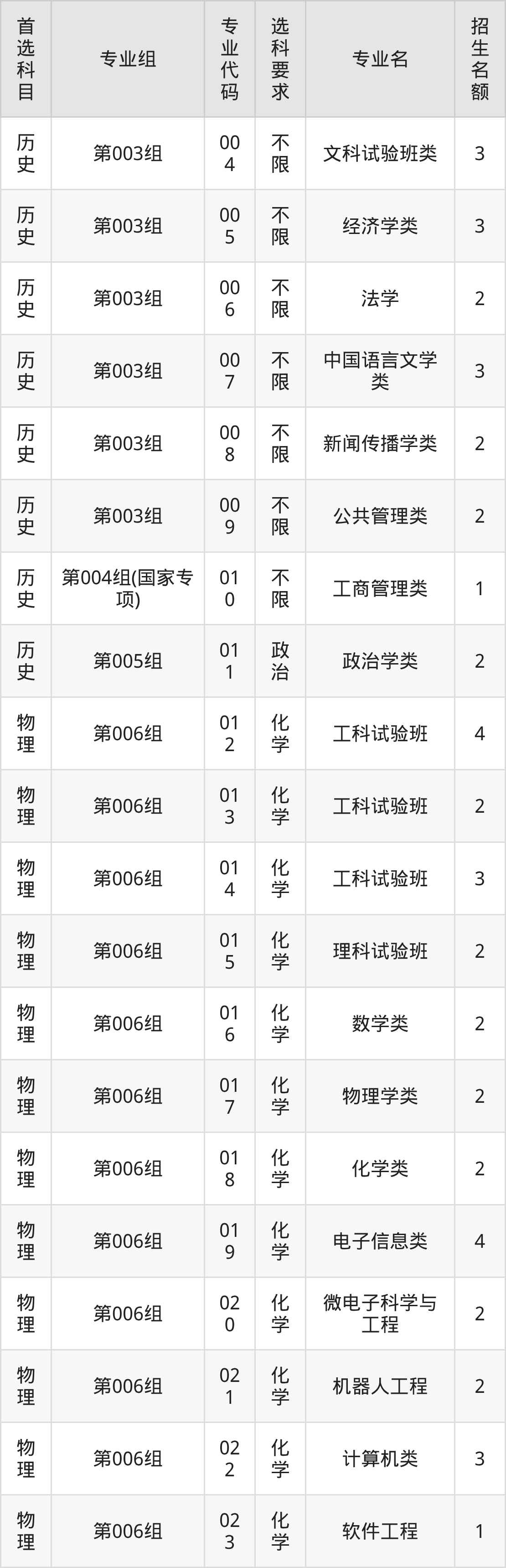 各专业选科要求、招生名额汇总如下: