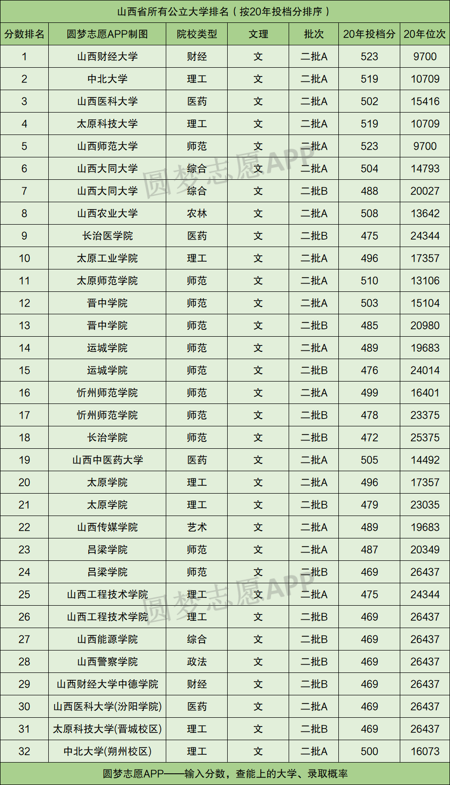 按照投档分数线的高低排序,本文将所有位于山西省内且在本科二批次招文科生的大学展示在如下这份榜单中,供同学们参考: