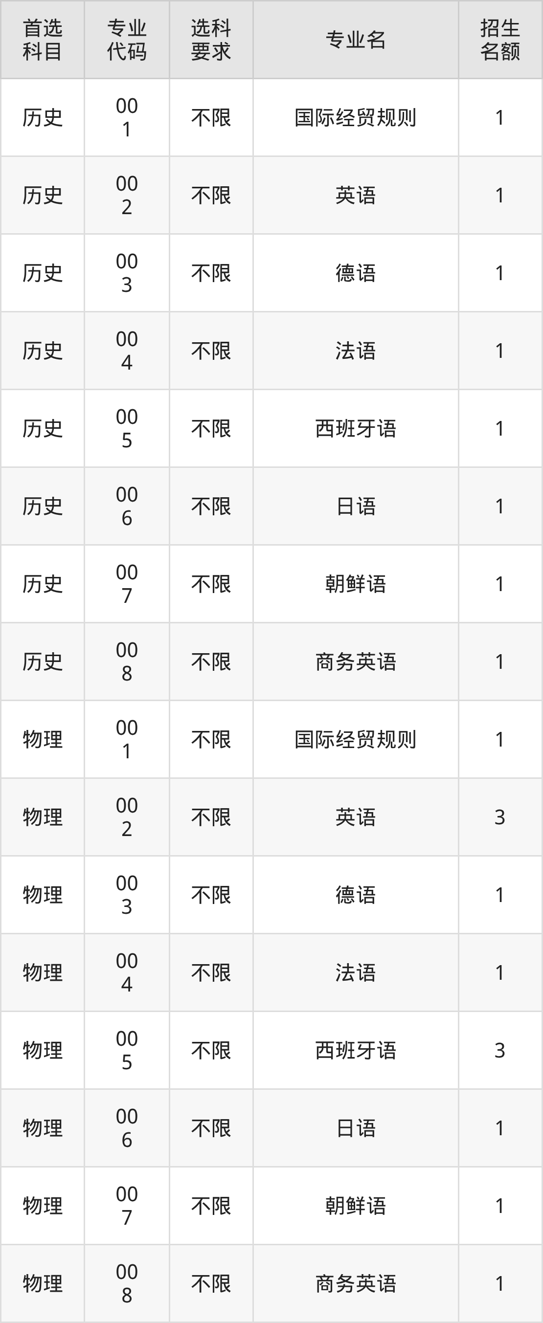 各专业选科要求、招生名额汇总如下: