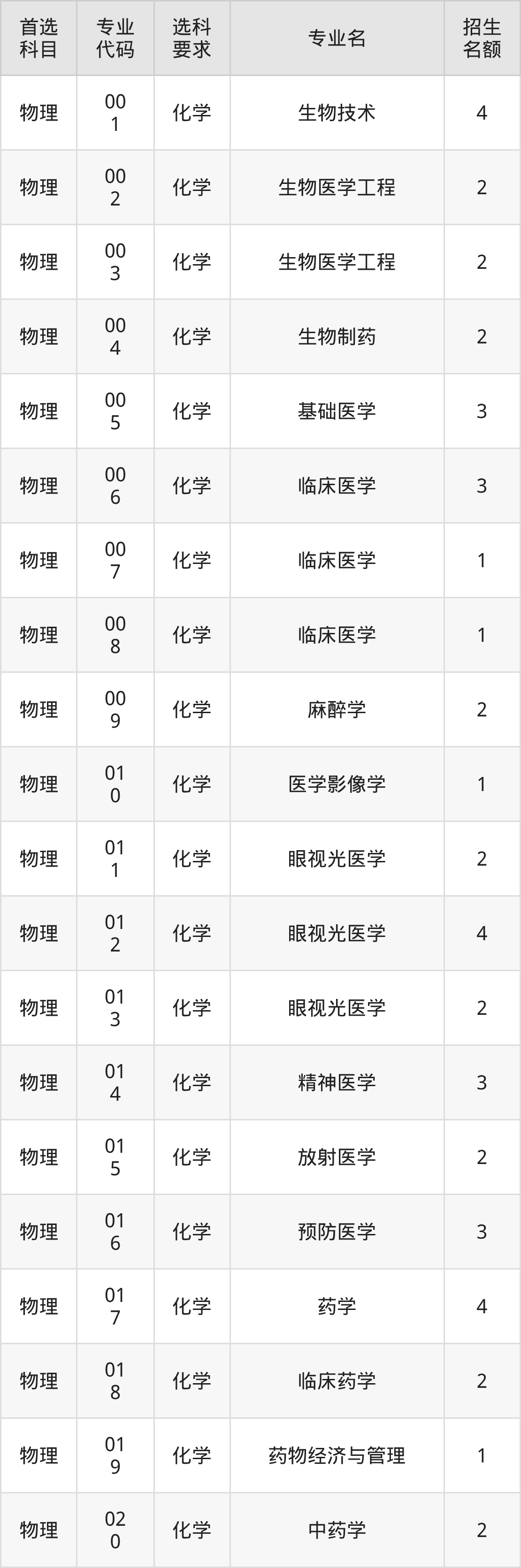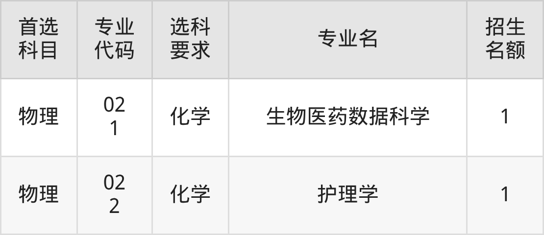 各专业选科要求、招生名额汇总如下: