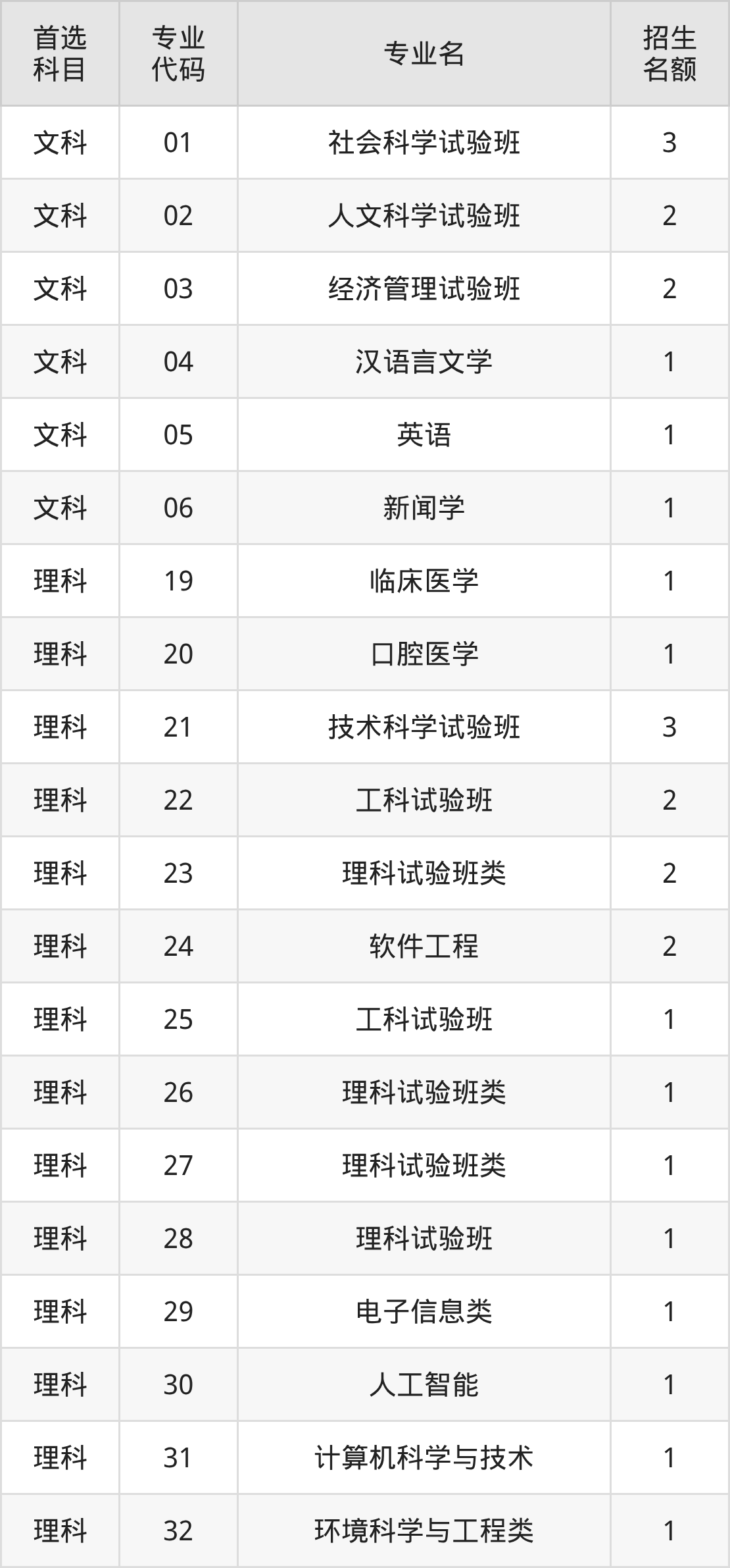 2025年南京大学在新疆维吾尔自治区本科一批招生中,总计划人数为32人,招生专业有18个,包括社会科学试验班(3人)、人文科学试验班(2人)、经济管理试验班(2人)、汉语言文学(1人)等。