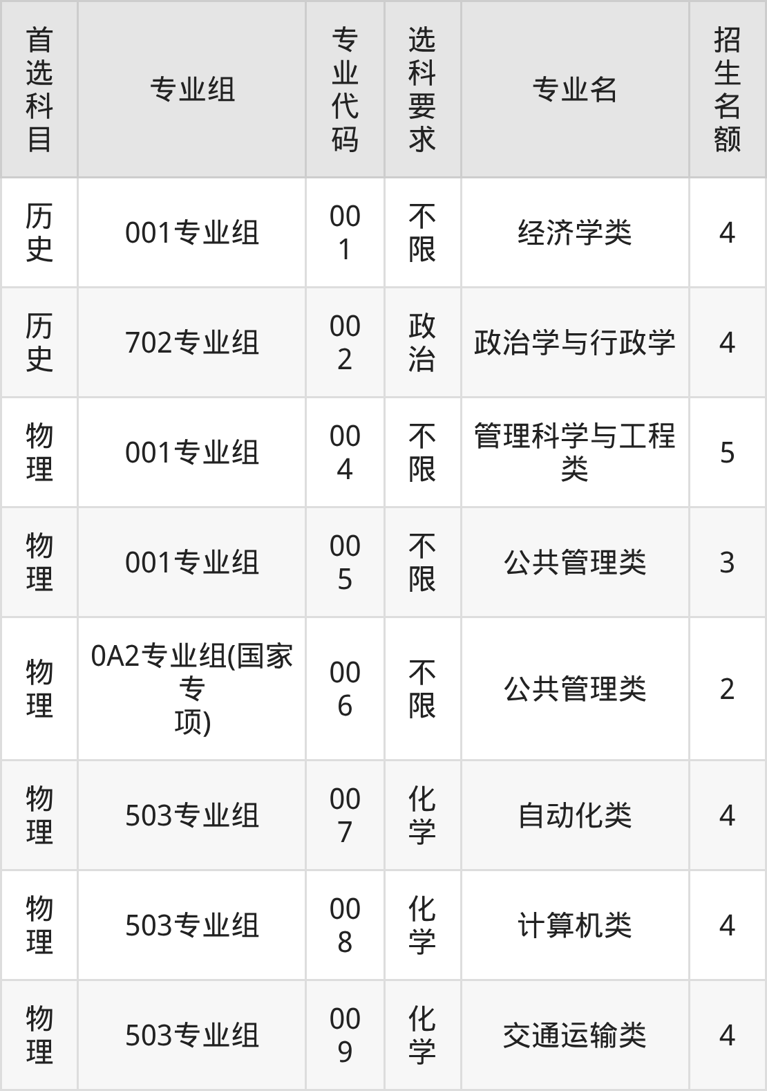 各专业选科要求、招生名额汇总如下: