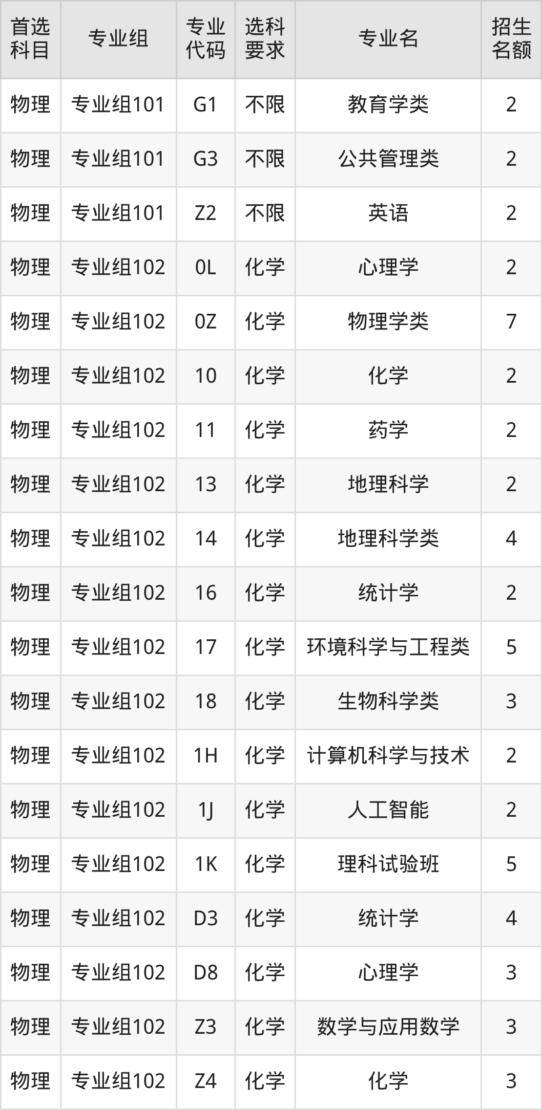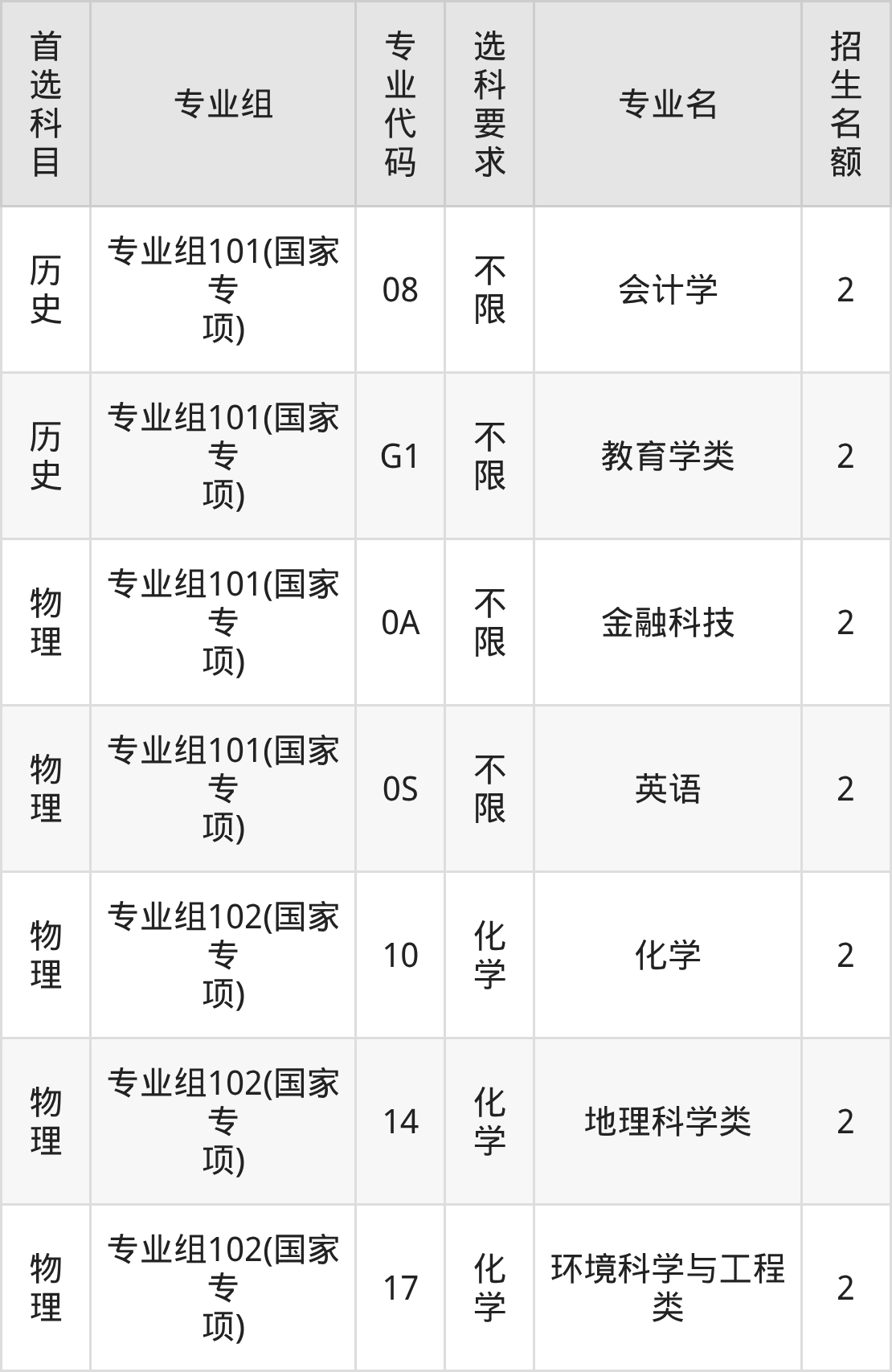 各专业选科要求、招生名额汇总如下: