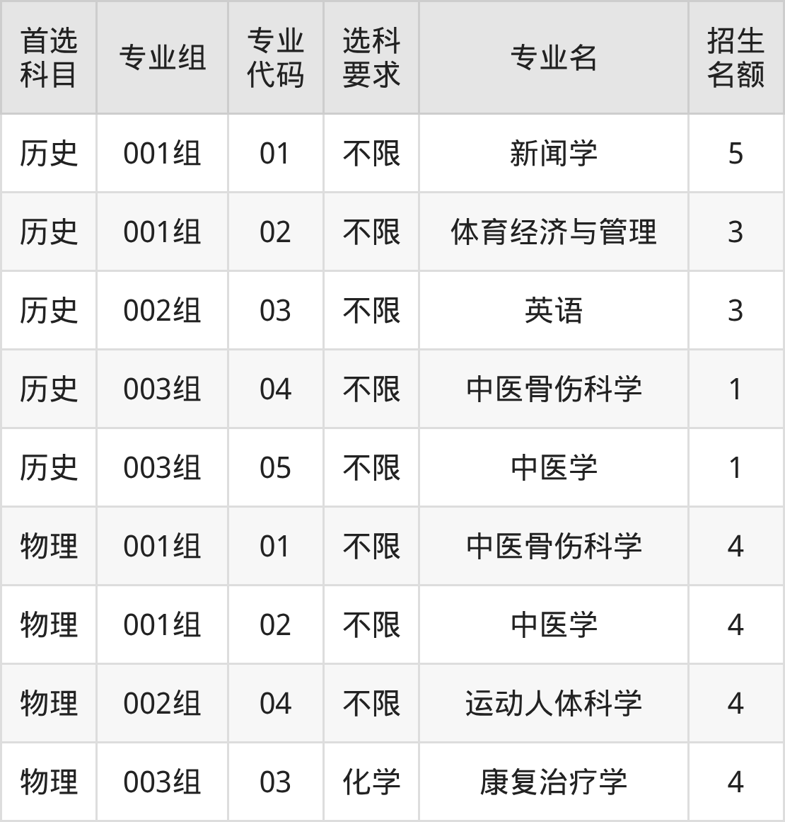 各专业选科要求、招生名额汇总如下: