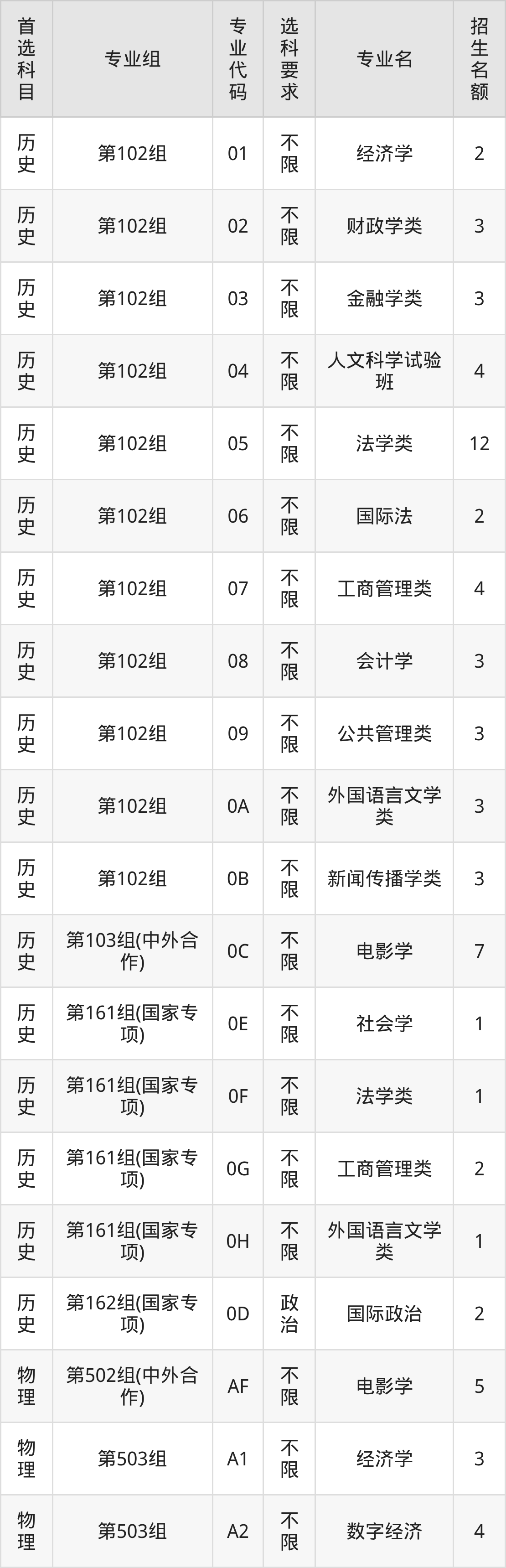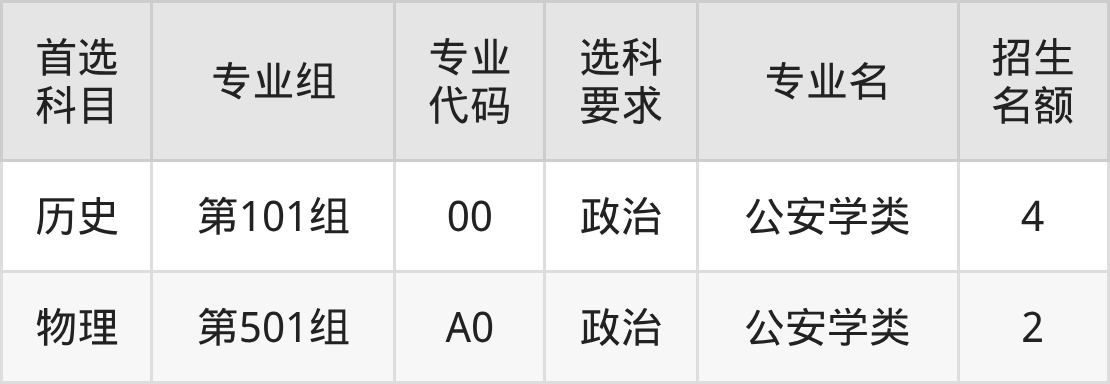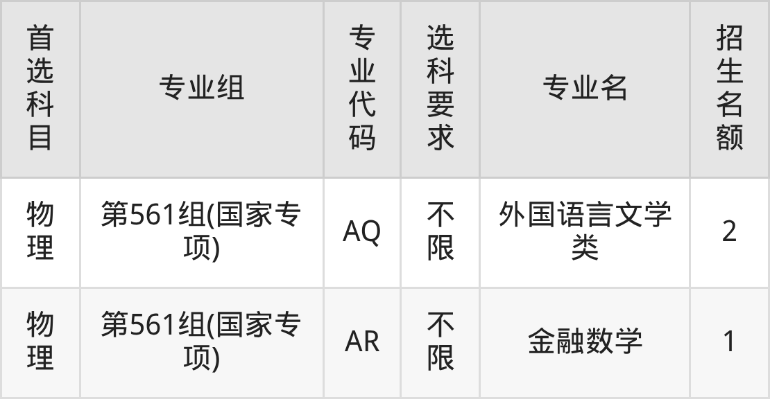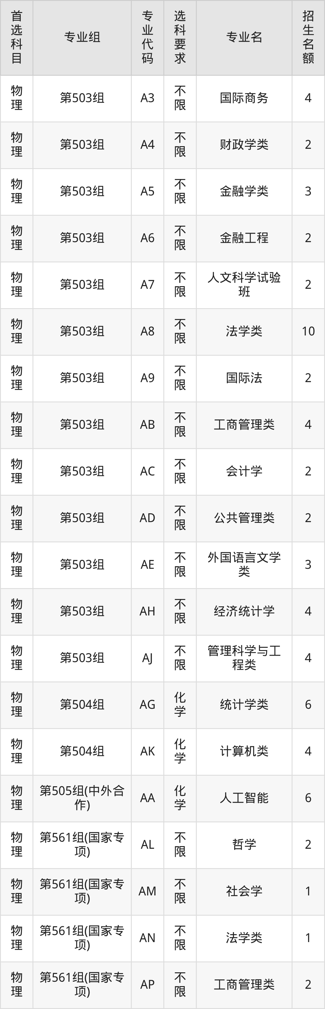 各专业选科要求、招生名额汇总如下: