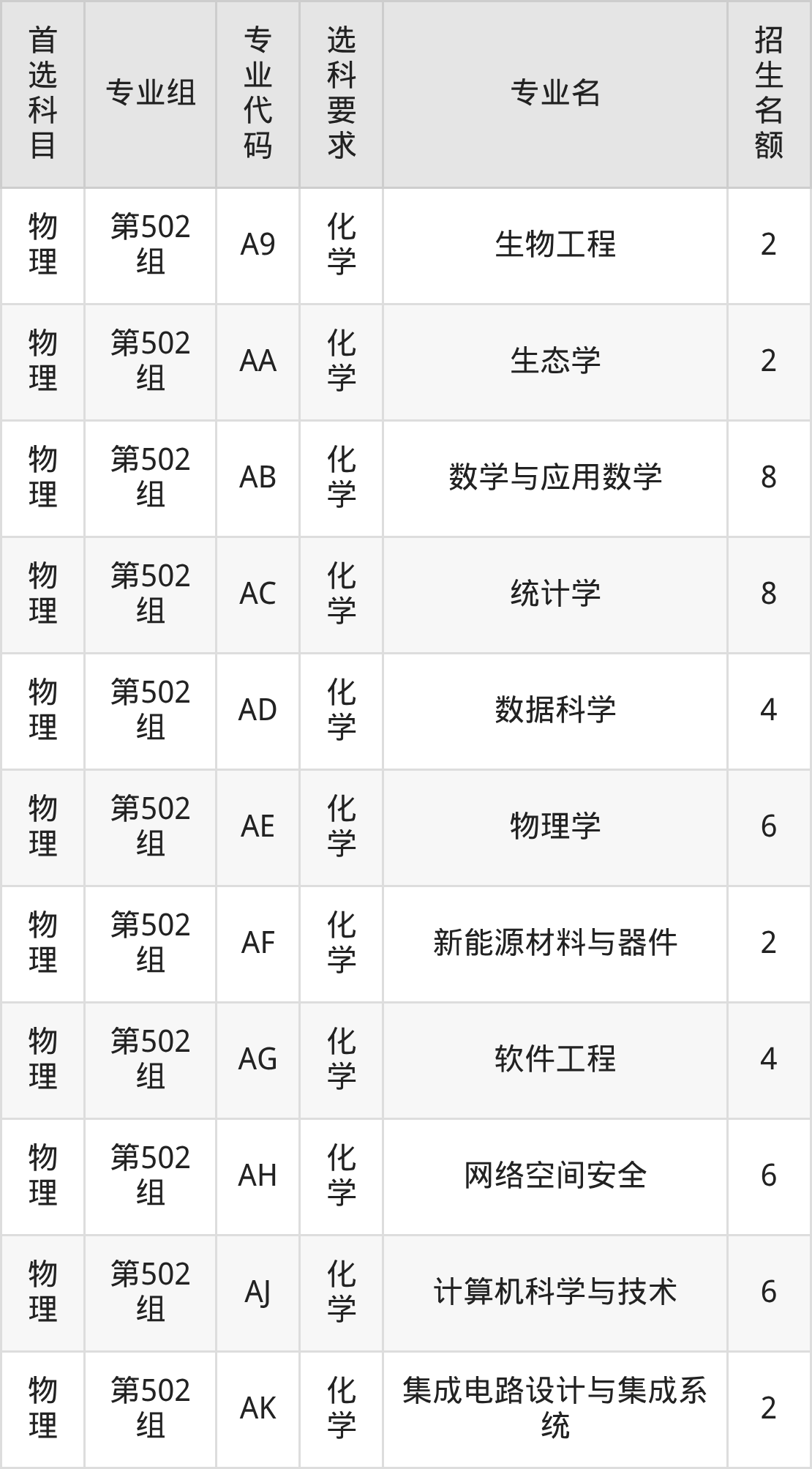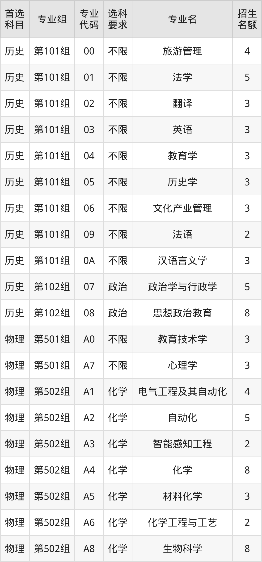 各专业选科要求、招生名额汇总如下:
