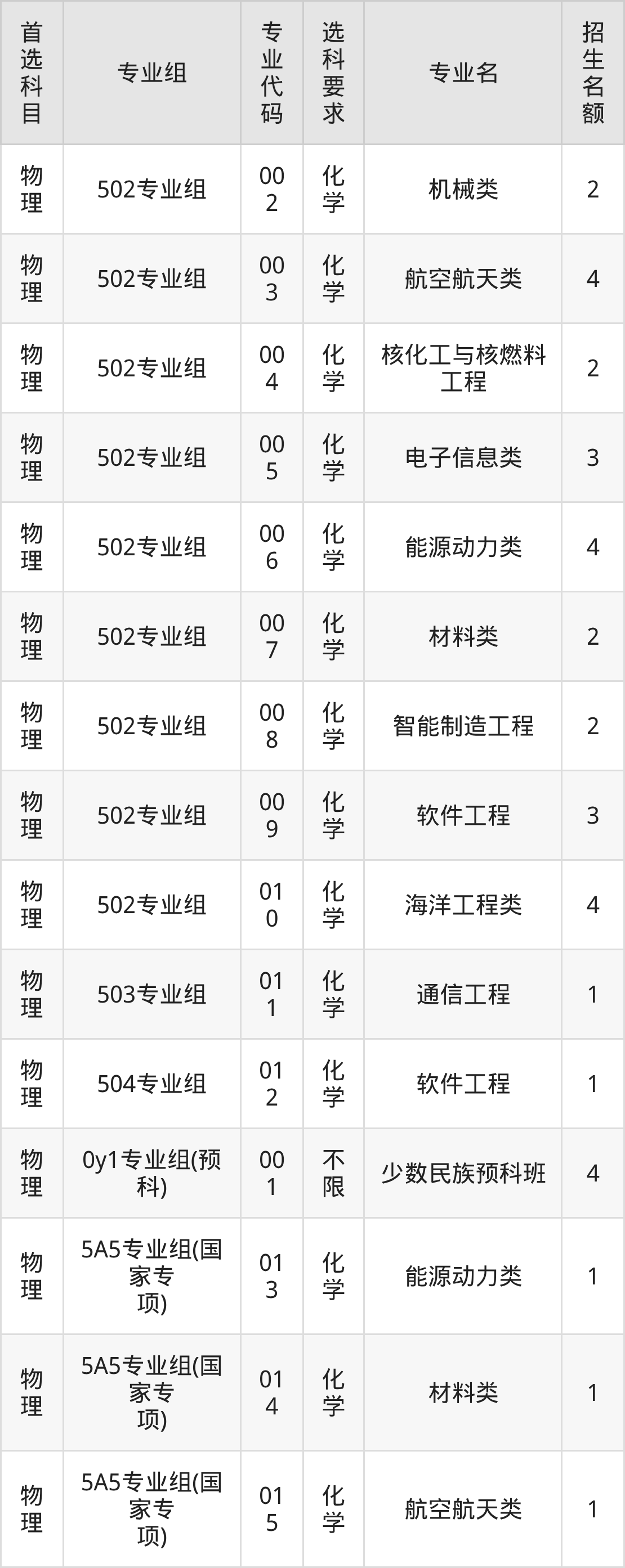 各专业选科要求、招生名额汇总如下: