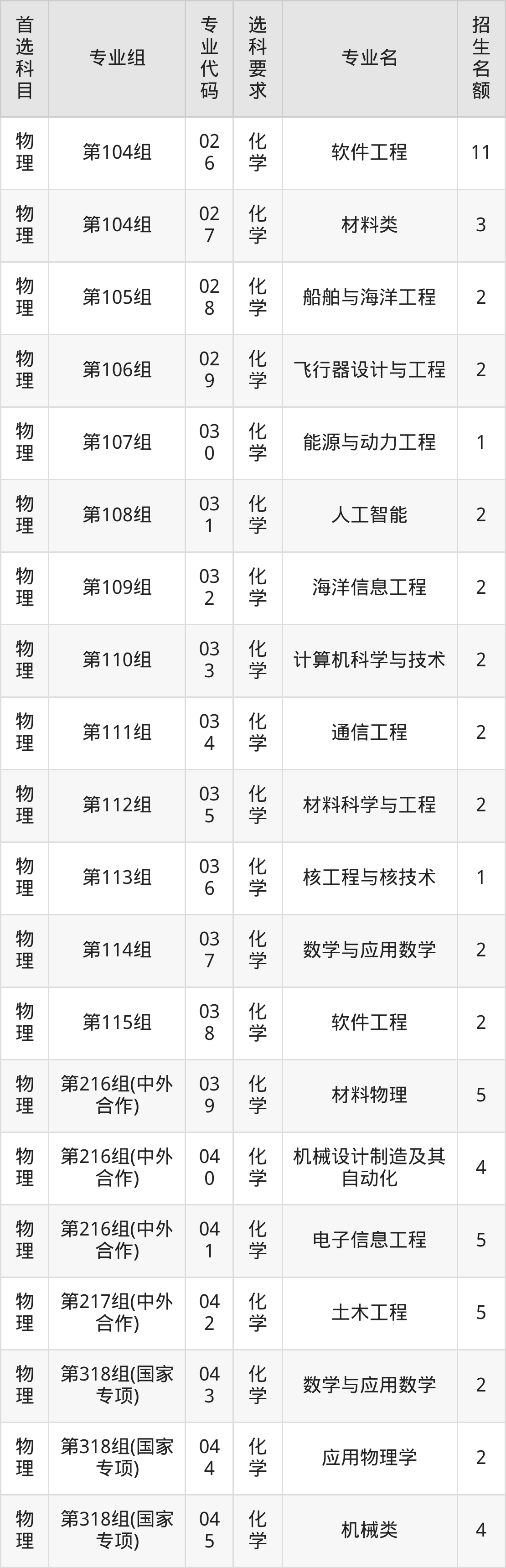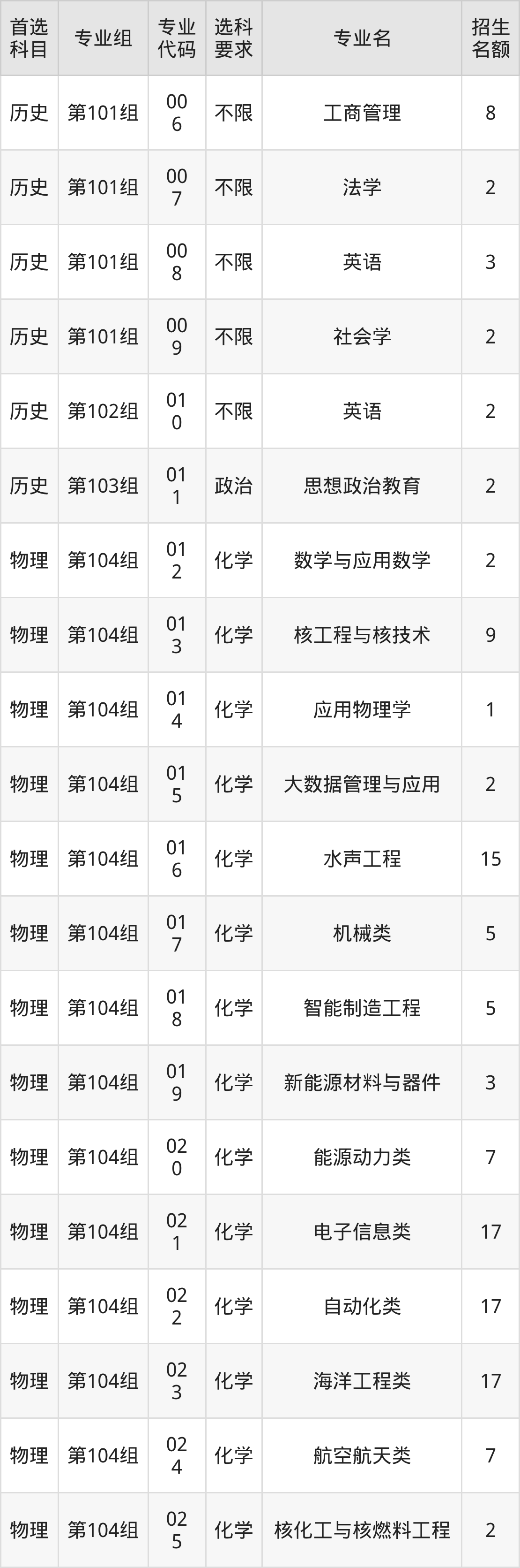 各专业选科要求、招生名额汇总如下: