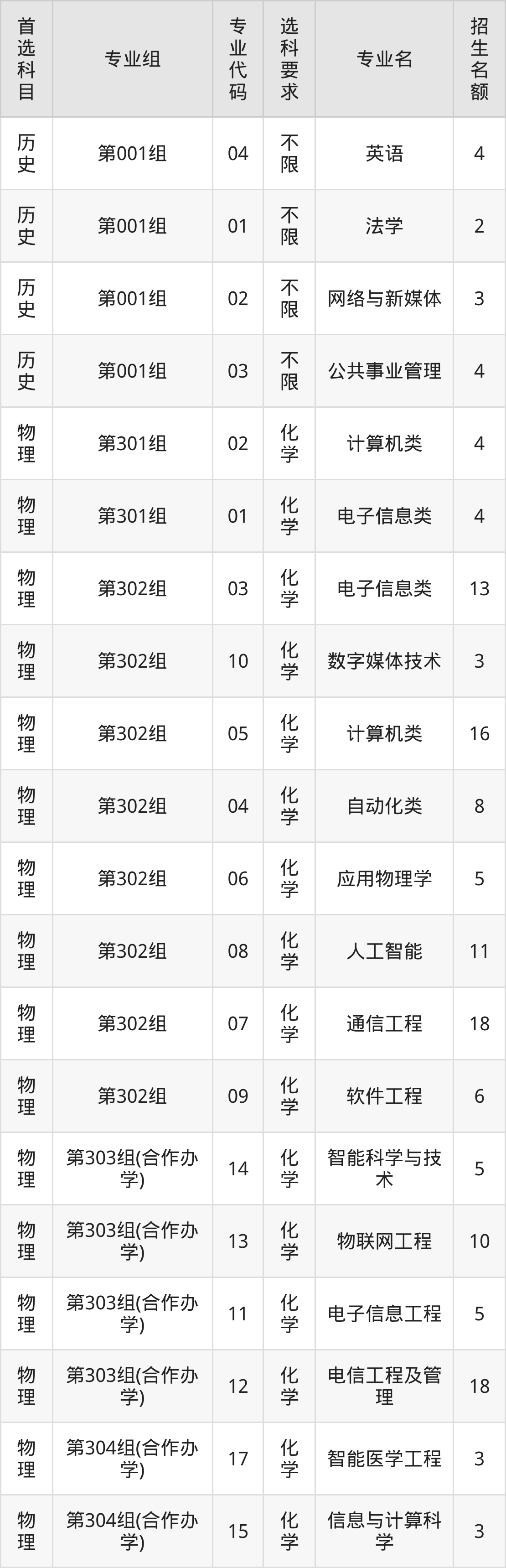 各专业选科要求、招生名额汇总如下: