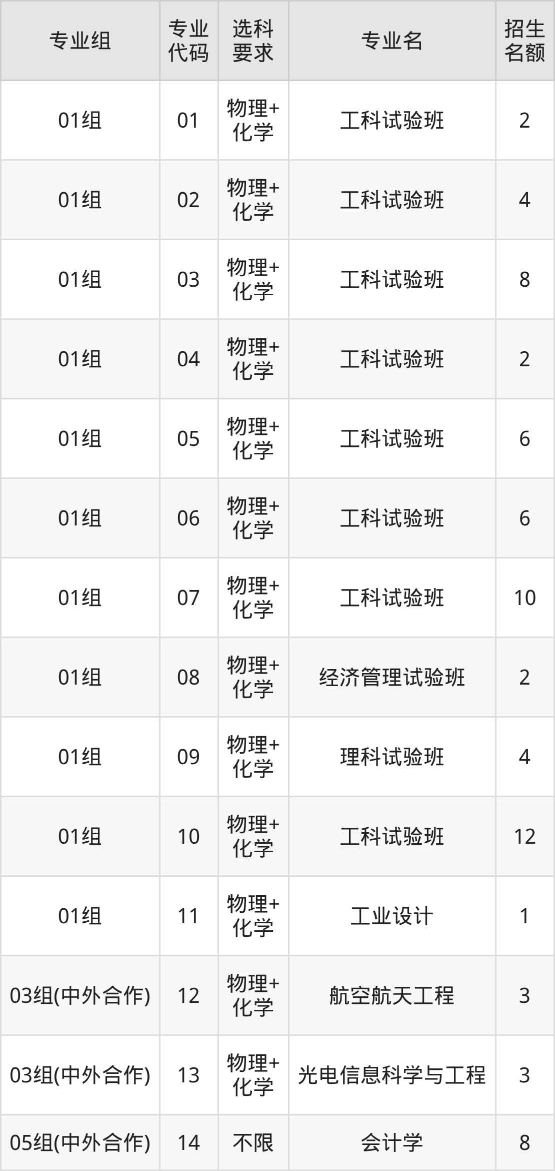 各专业选科要求、招生名额汇总如下:
