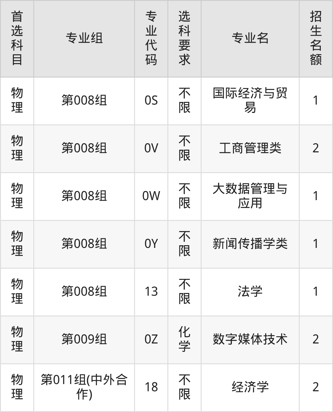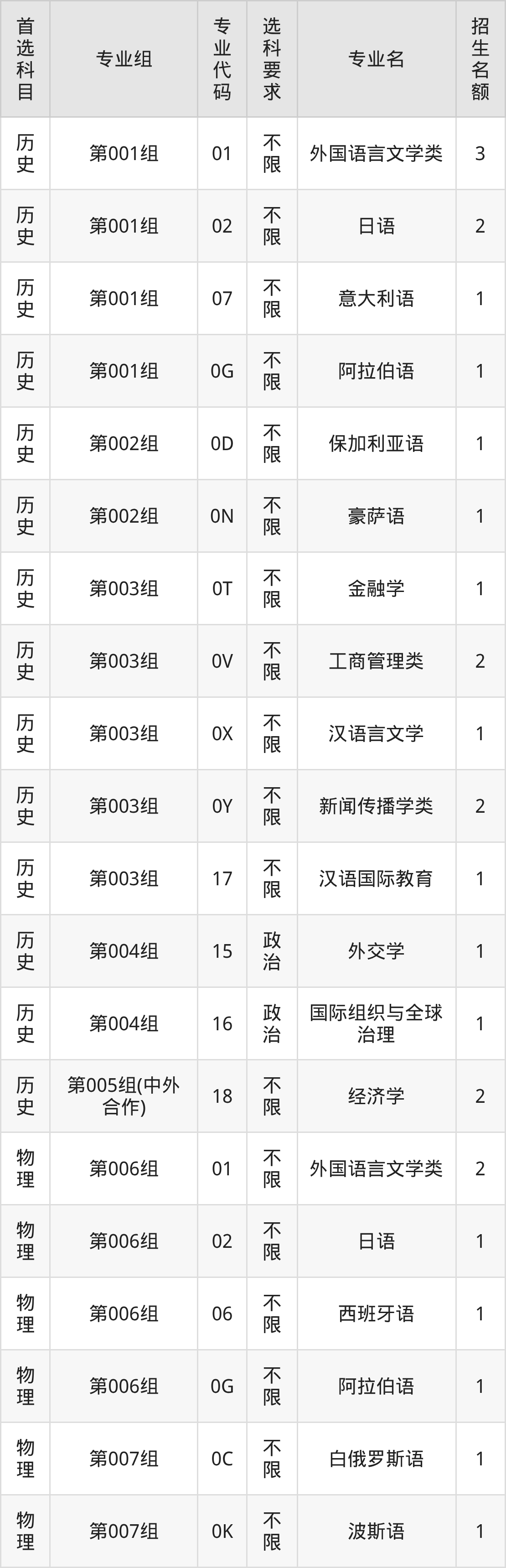 各专业选科要求、招生名额汇总如下: