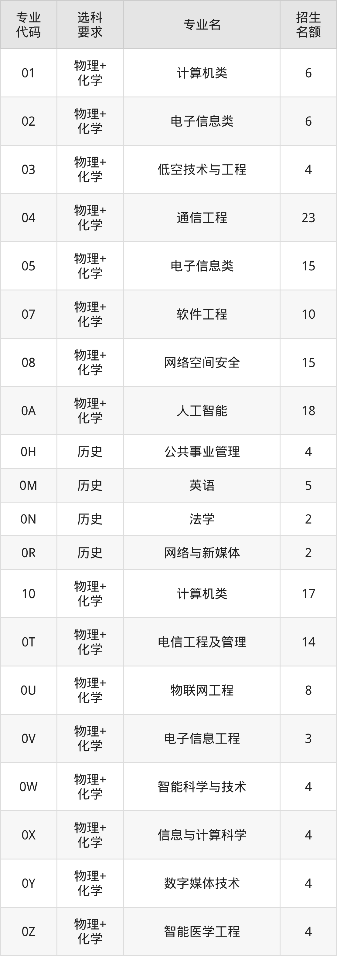 各专业选科要求、招生名额汇总如下: