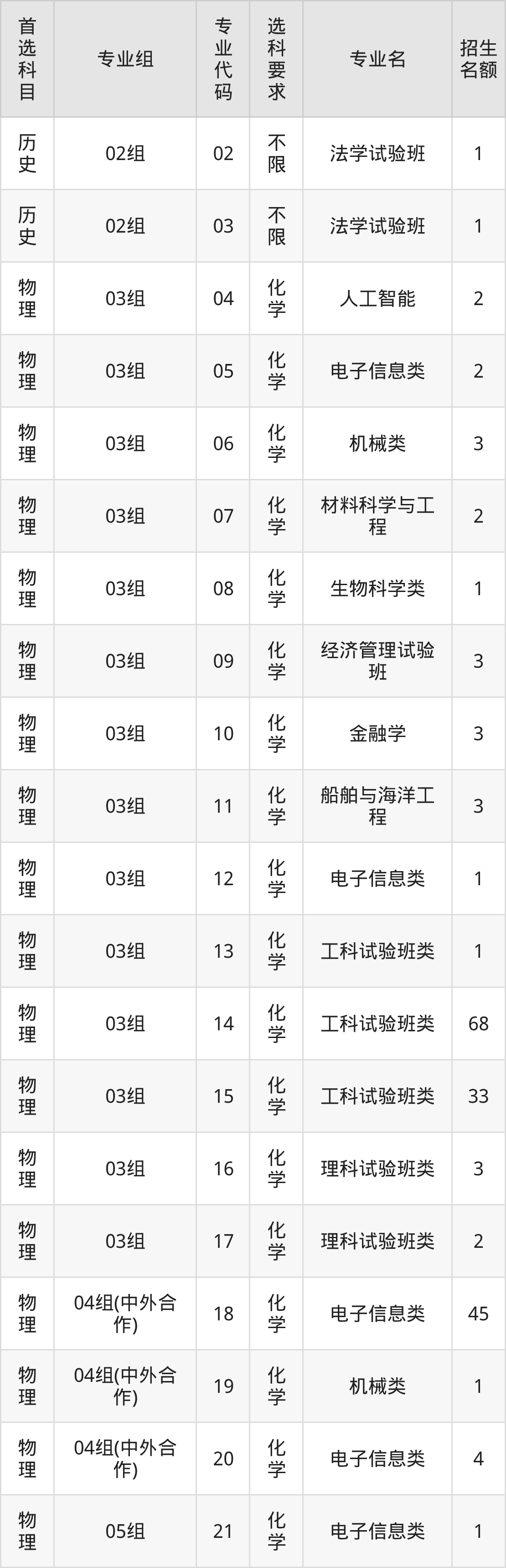 各专业选科要求、招生名额汇总如下: