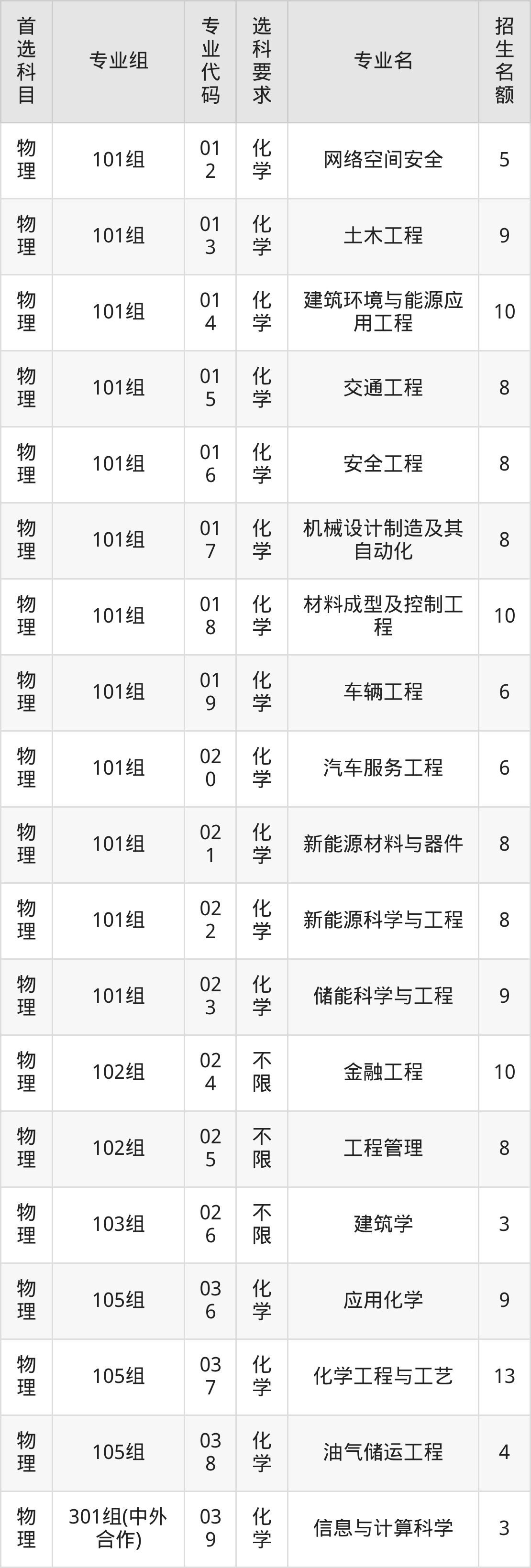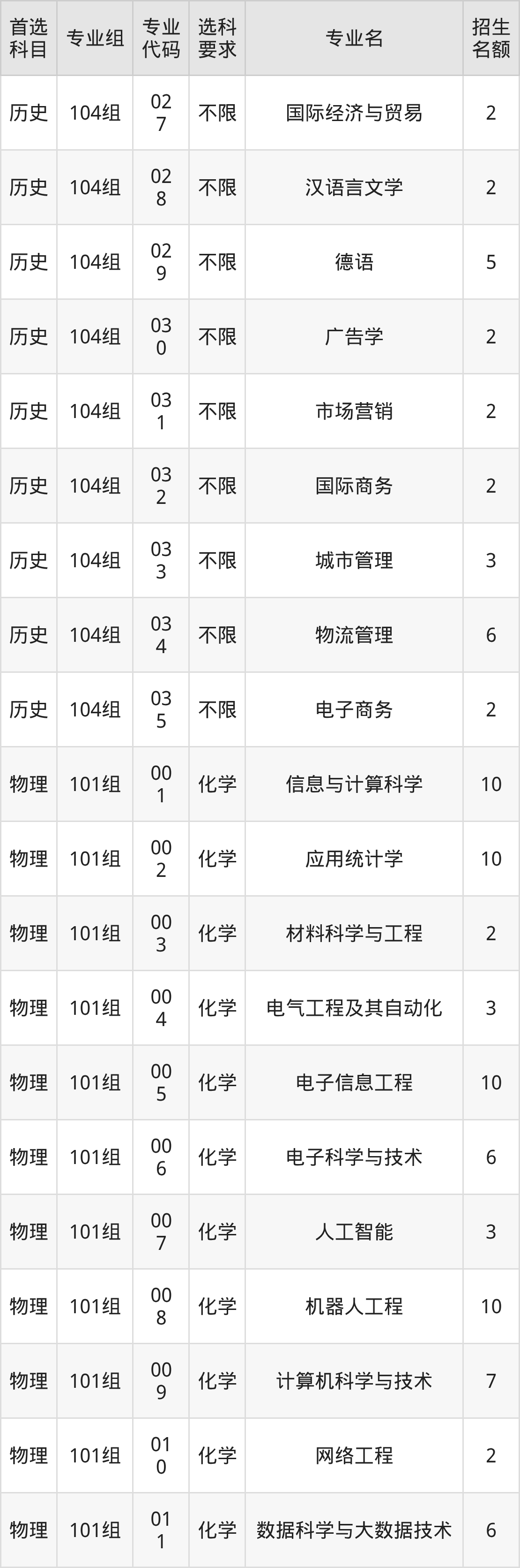 各专业选科要求、招生名额汇总如下: