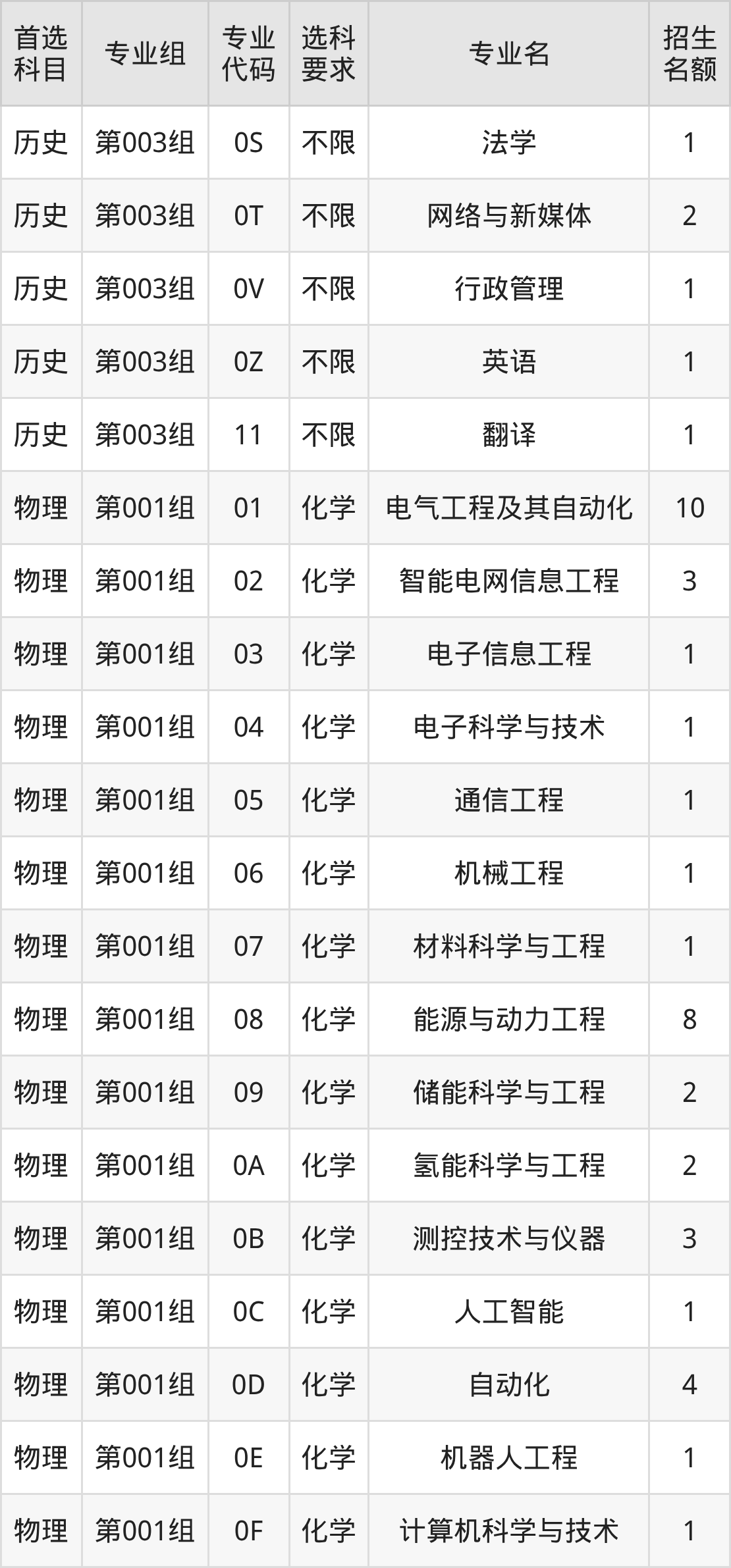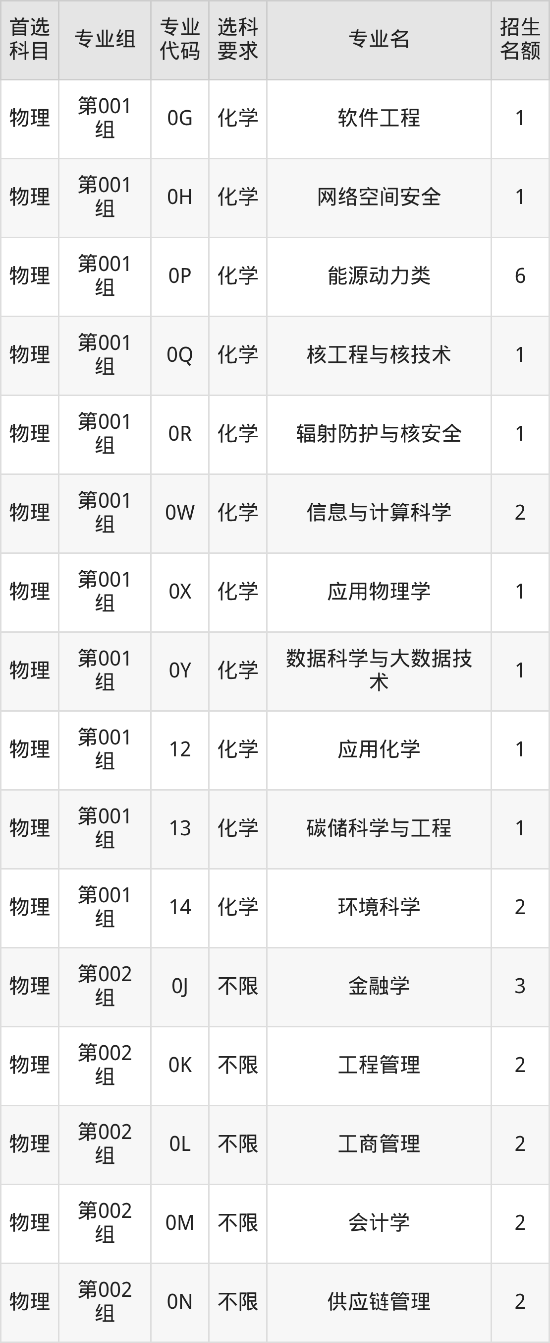 各专业选科要求、招生名额汇总如下: