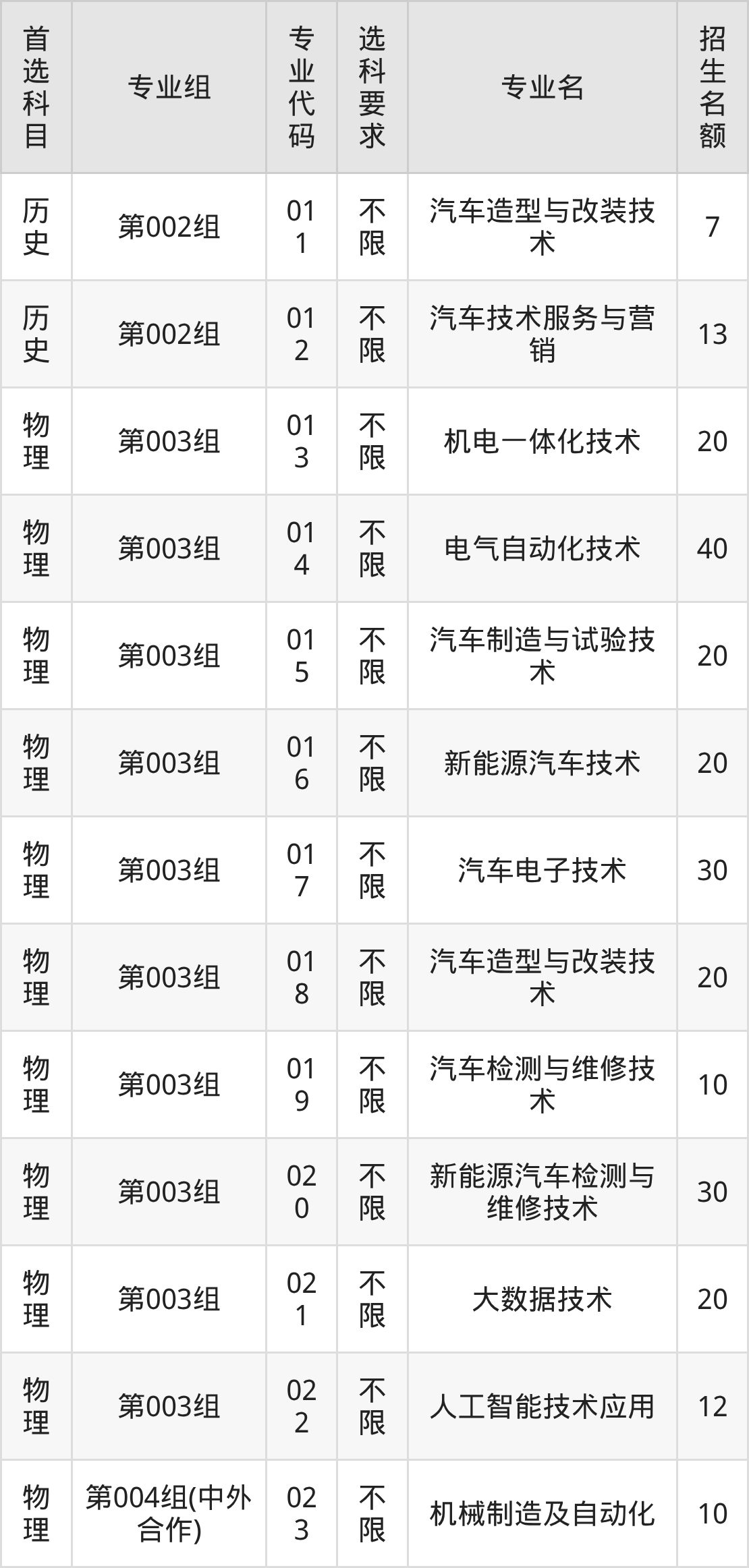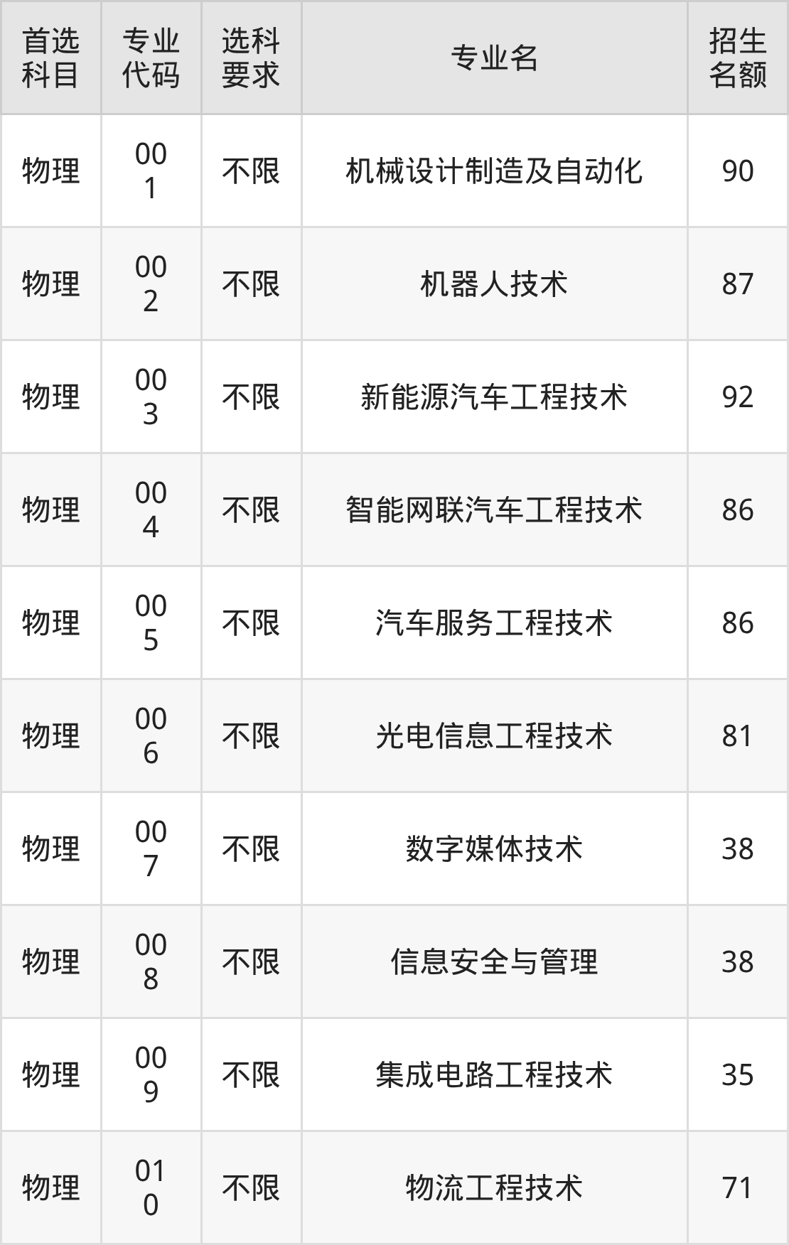 各专业选科要求、招生名额汇总如下: