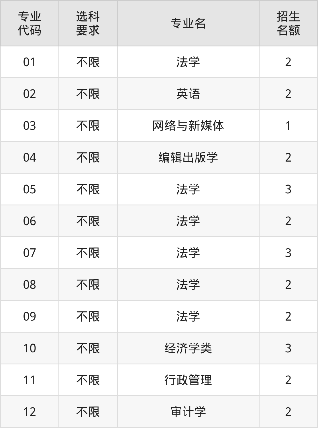 各专业选科要求、招生名额汇总如下: