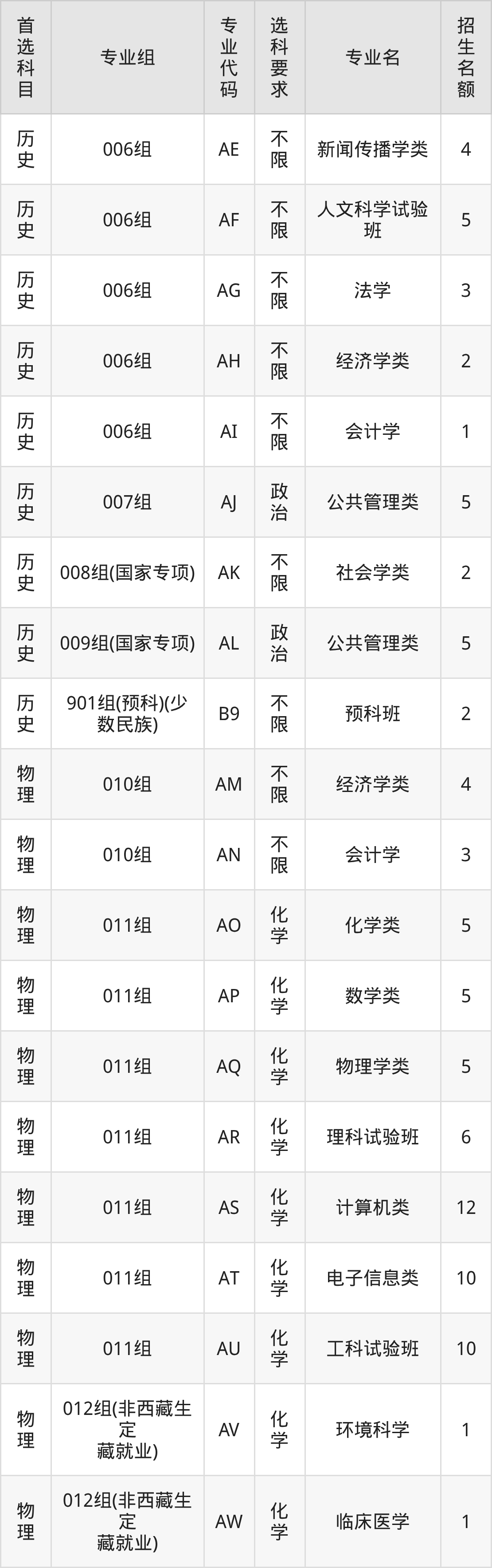 各专业选科要求、招生名额汇总如下: